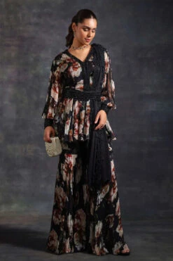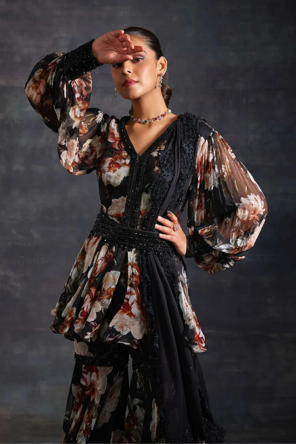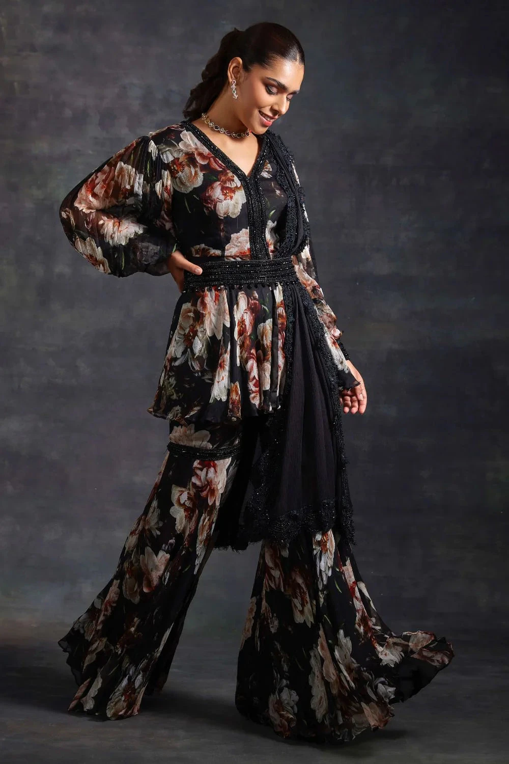 Kurta- front fastening printed kurta, blouson full sleeves, backless with drawstring, v neck, cuff with zipper, sharara- divided sharara, front belted back elasticated, dupatta- crinkle chiffon embroidered dupatta, belt- drawstring embroidered belt.