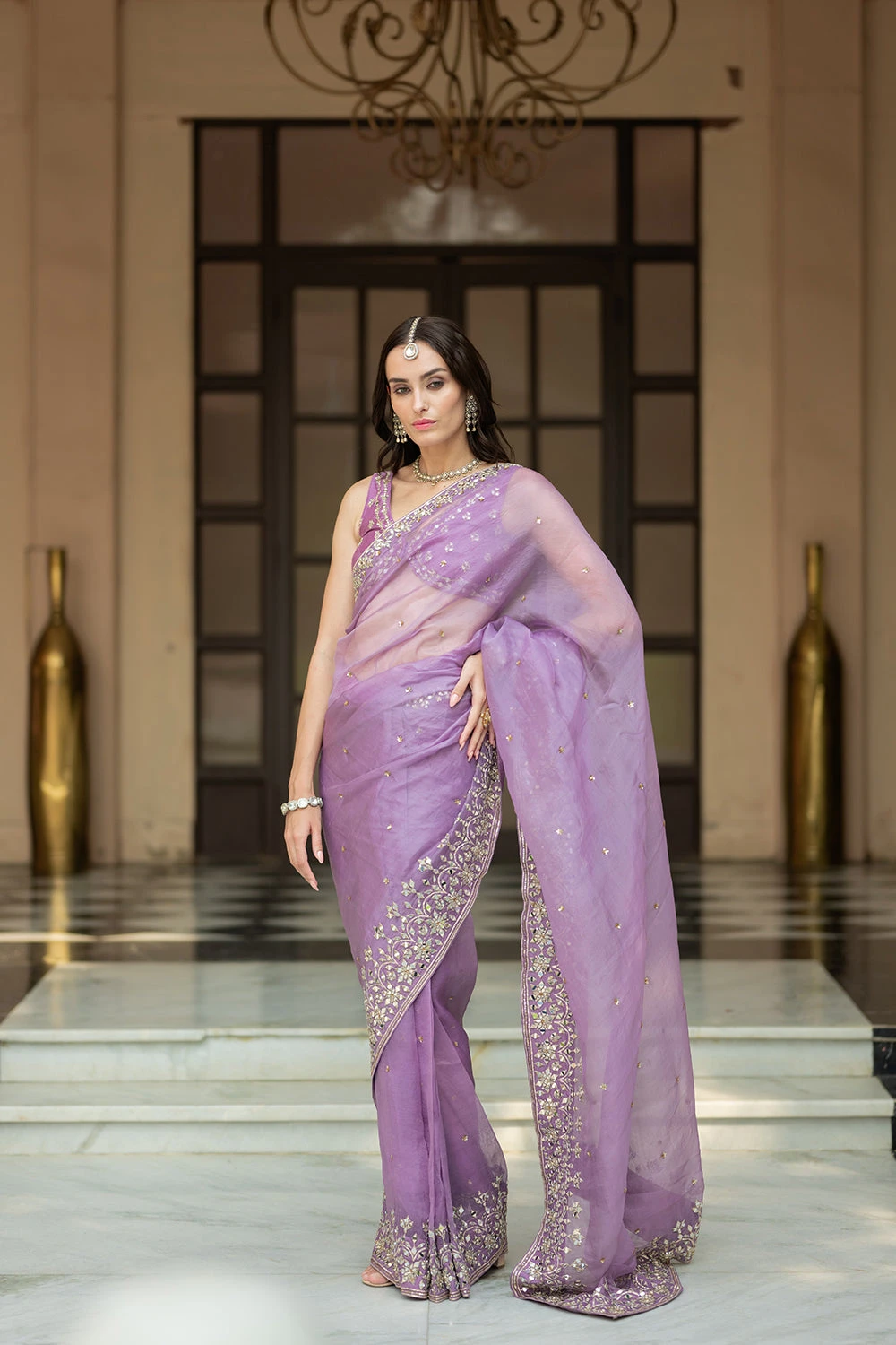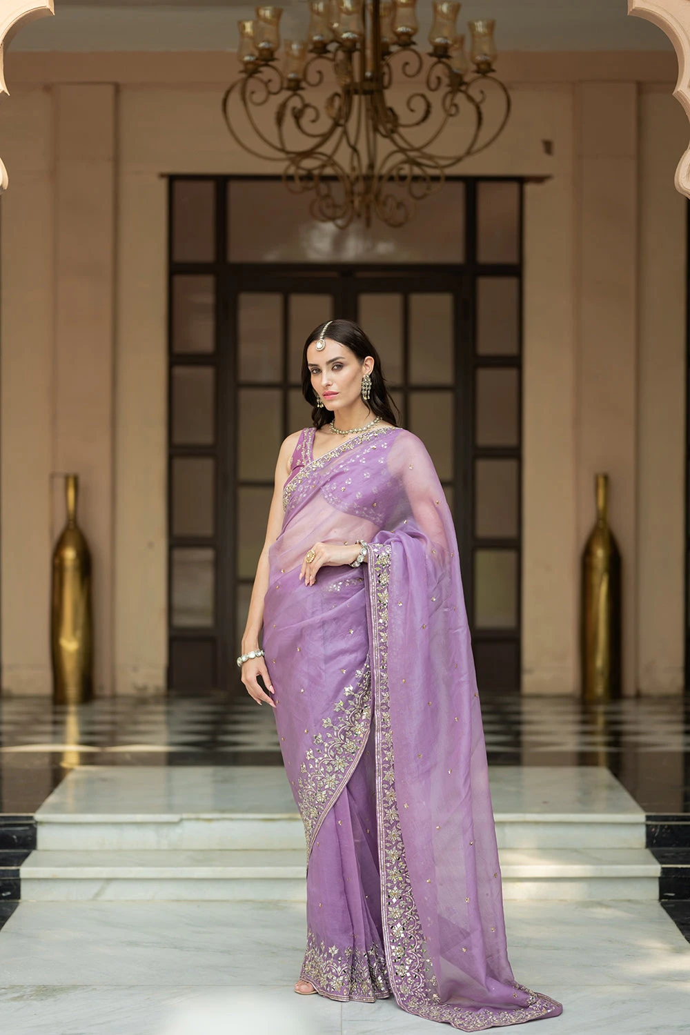 Featuring an lavinder pleated saree in organza base embellished with mirror gota and sequence . It is paired with chanderi blouse .It comes with semi crepe petticoat .