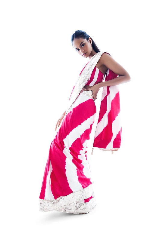 Natural hand dyed lehriya saree with embossed silver gotta paired with printed striped bustier .
