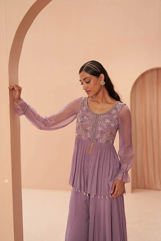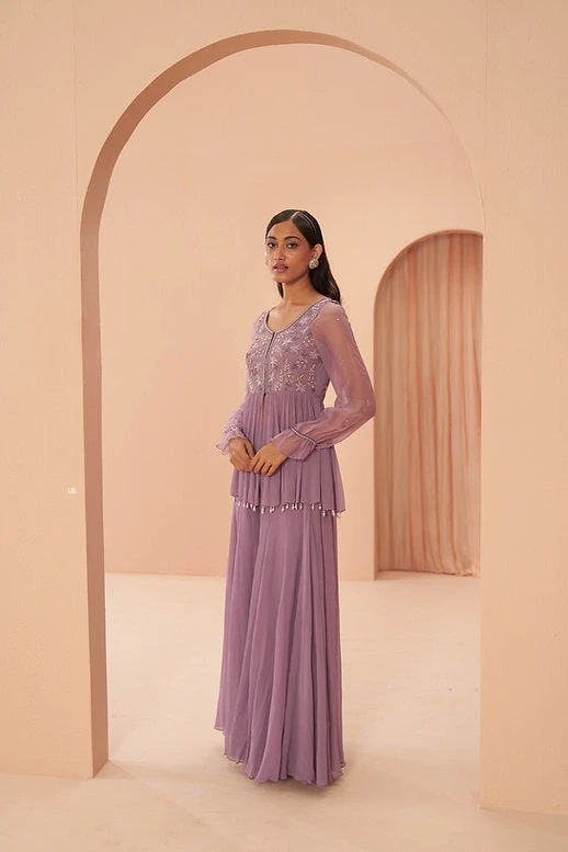 A beautiful peplum sharara set with delicate floral embroidery on torso.