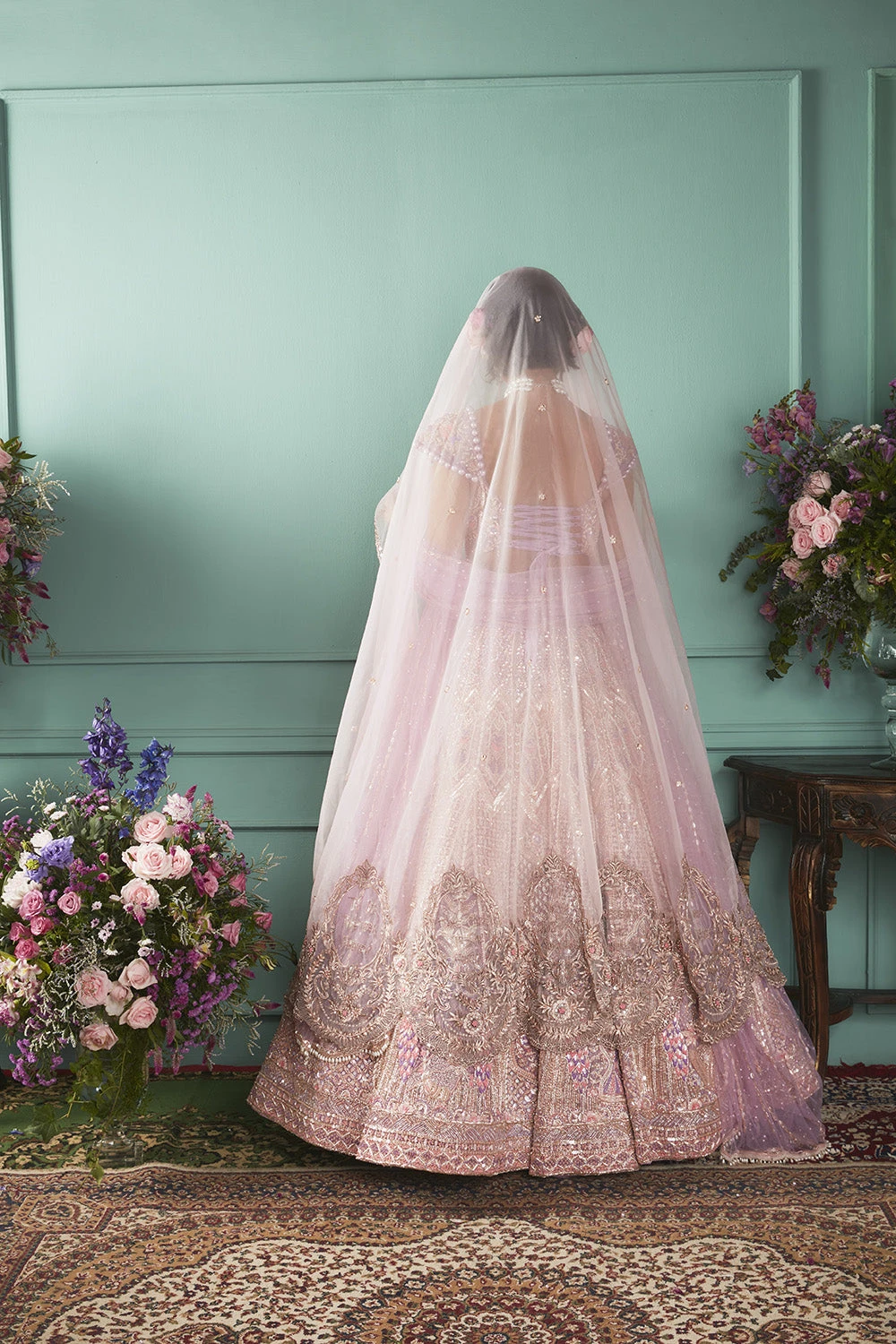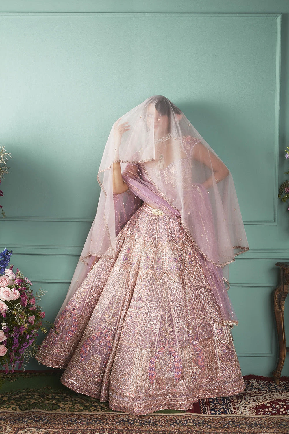 Featuring a lilac lehenga in velvet base with zardosi, french knot, and mukaish work embroidery. It is paired with a corset style blouse with pearl detailing and a net dupatta.