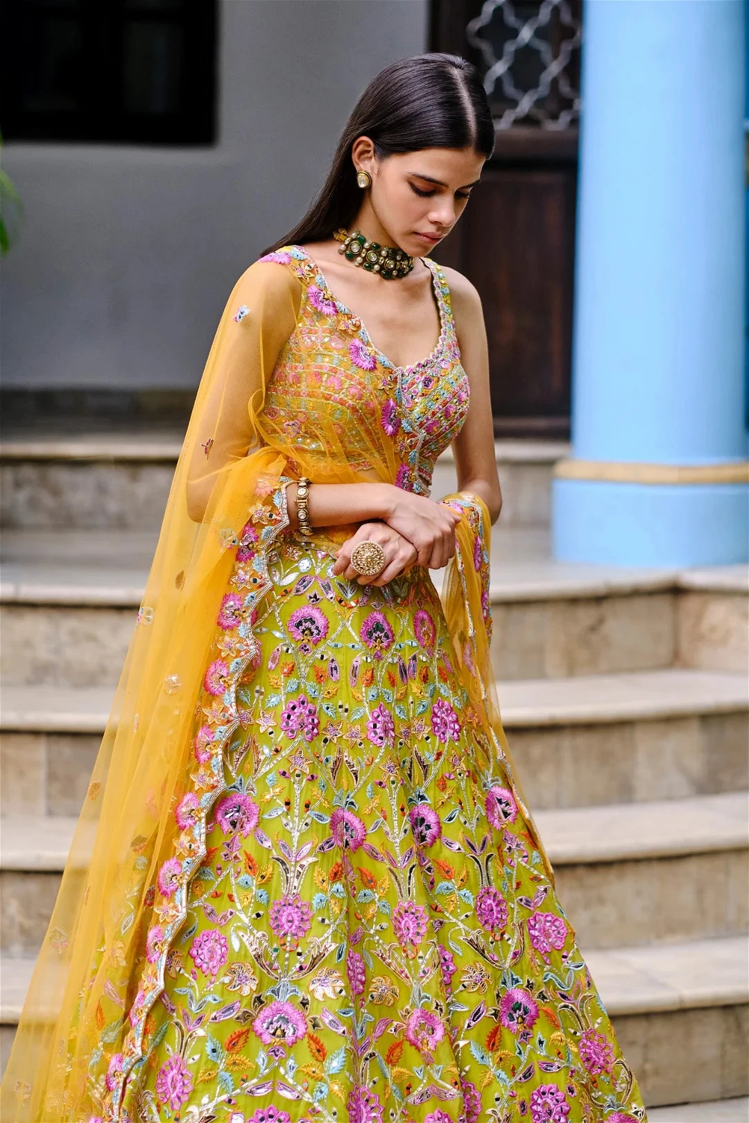 - Featuring A Lime Green Soft Organza Lehenga With Pink Thread Flowers, Touches Of Mirror, Foil Embroidery. It Has A Yellow Net Dupatta And Linear Pattern Blouse To Complete The Look.