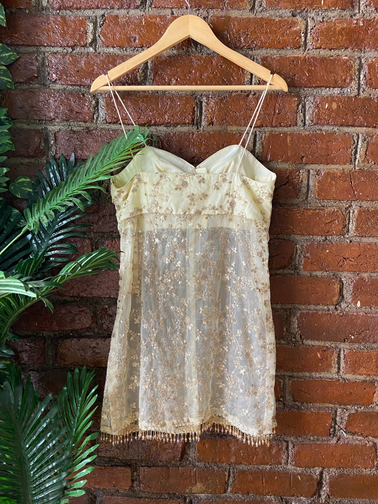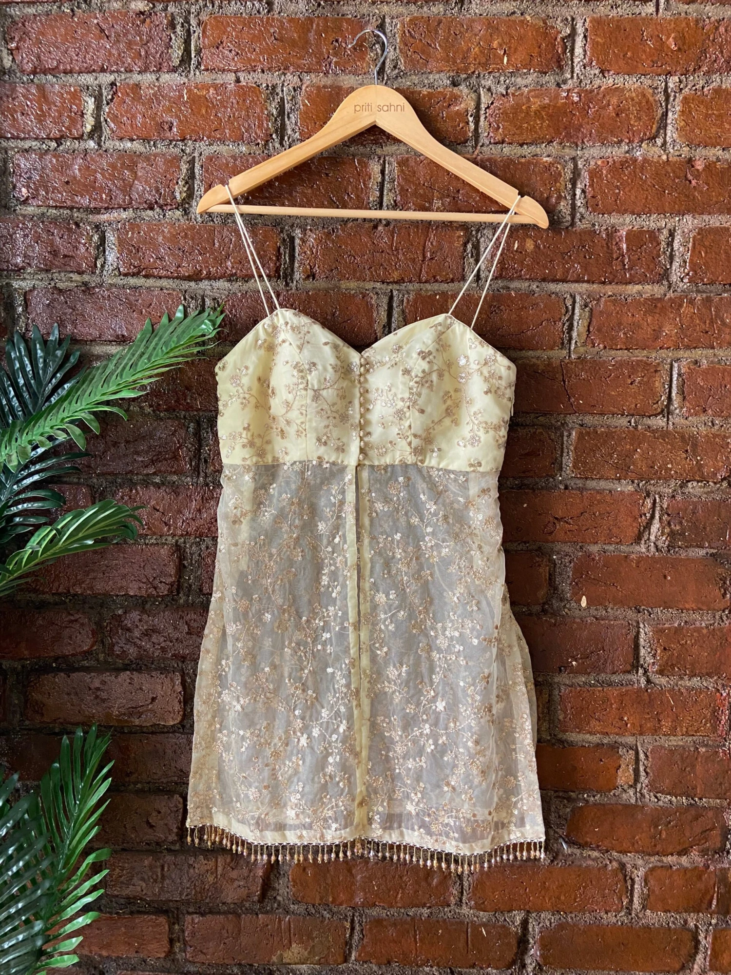 Lime yellow organza slip kurta with delicate zari work detailing, paired with Georgette gharara pant and Organza dupatta in sequin work and scallop edging