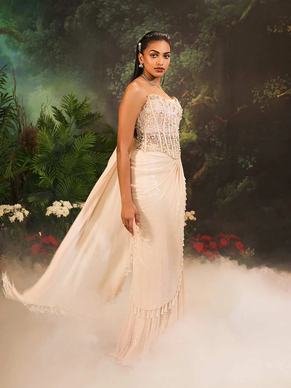 Exuding glamour for opulent celebrations and festive gatherings, our LUMI Saree Set is a stunning masterpiece. The set features a beautifully embellished corset blouse that enhances your silhouette, paired with a sequin drape saree that flows gracefully with every movement.