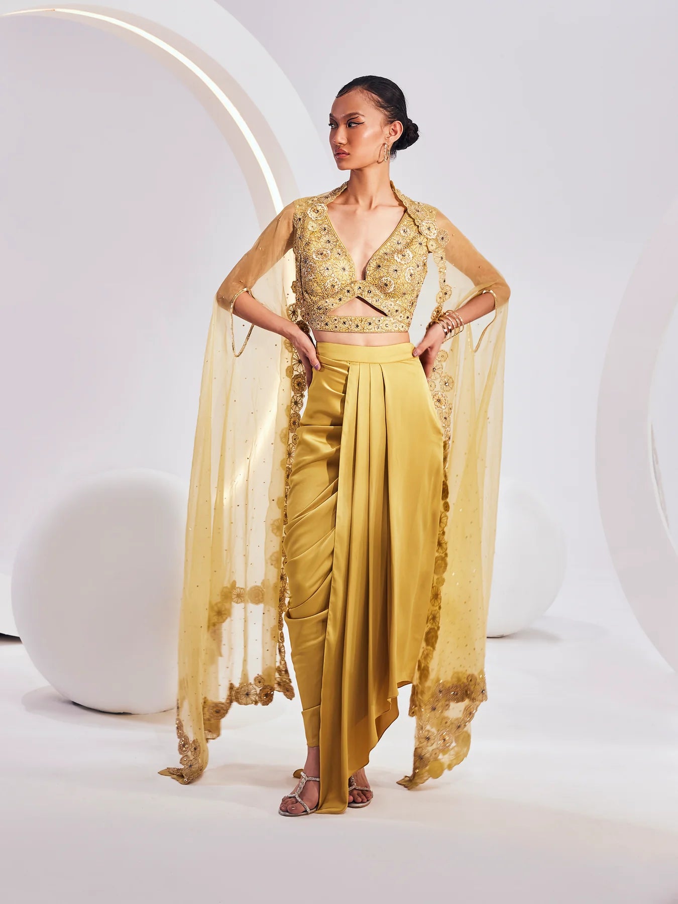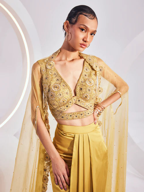 Sparking a source of inspiration in the world of couturier craft, LYDIA Cape Set is crafted out of fine weaves and luxurious textiles. The set is the amalgamation of a breezy and lively cape, an embellished blouse, and a pre-drape solid skirt.