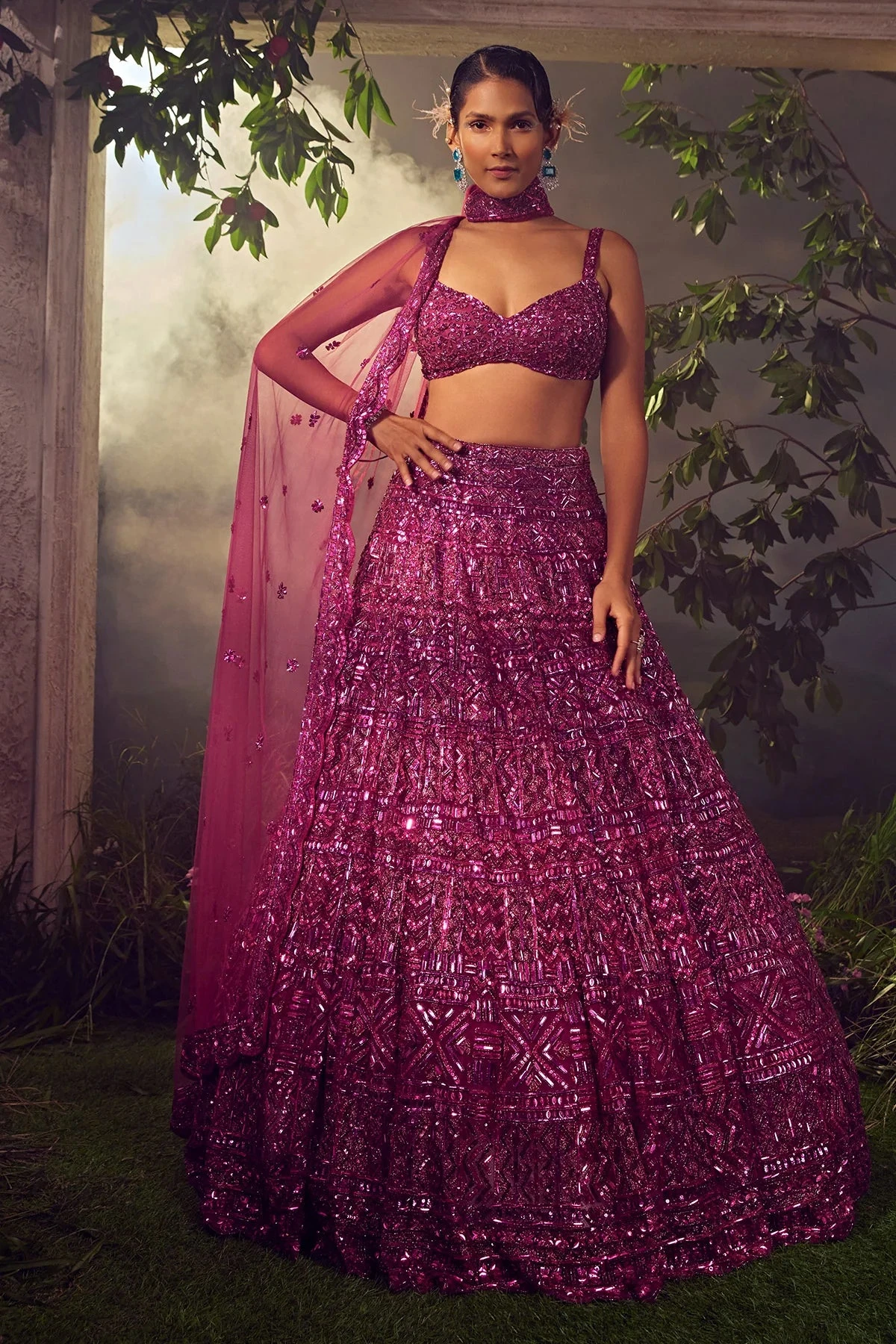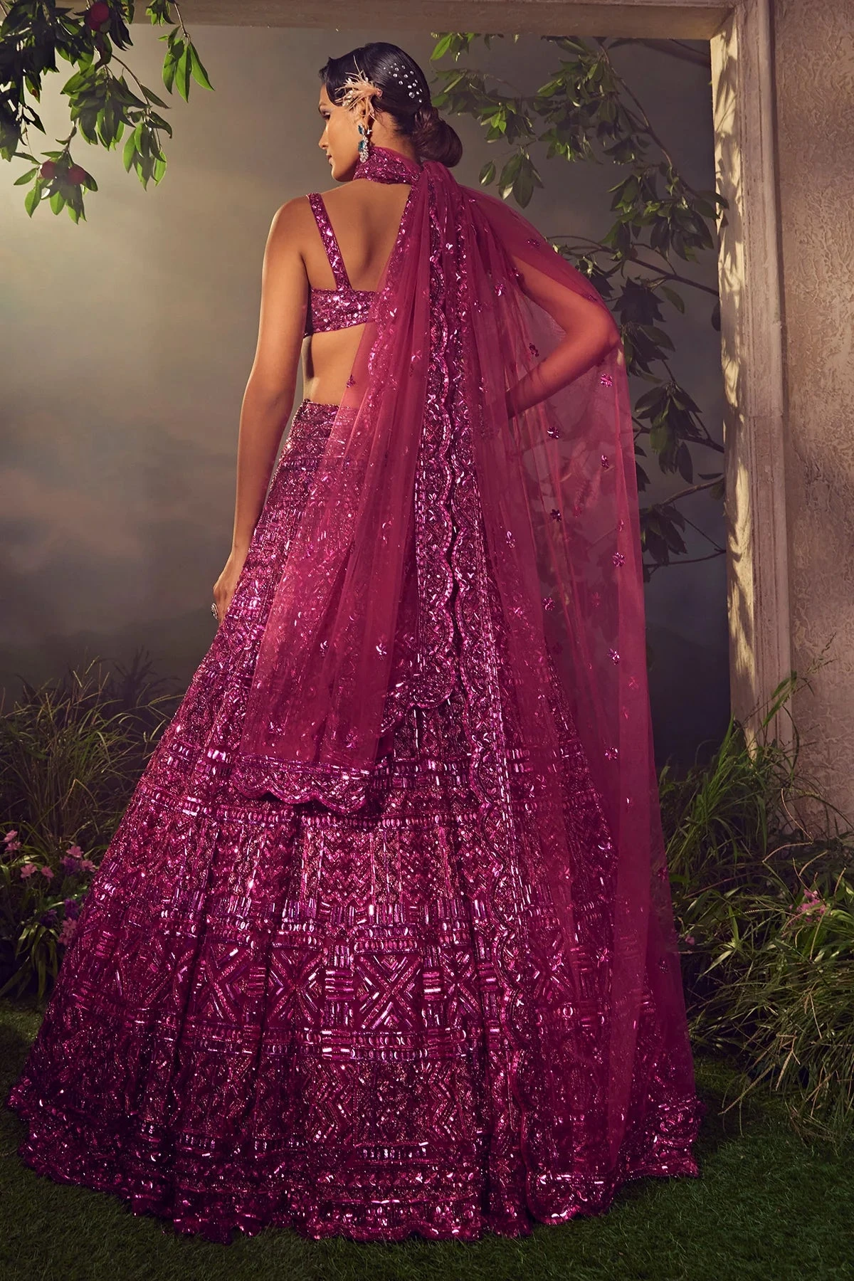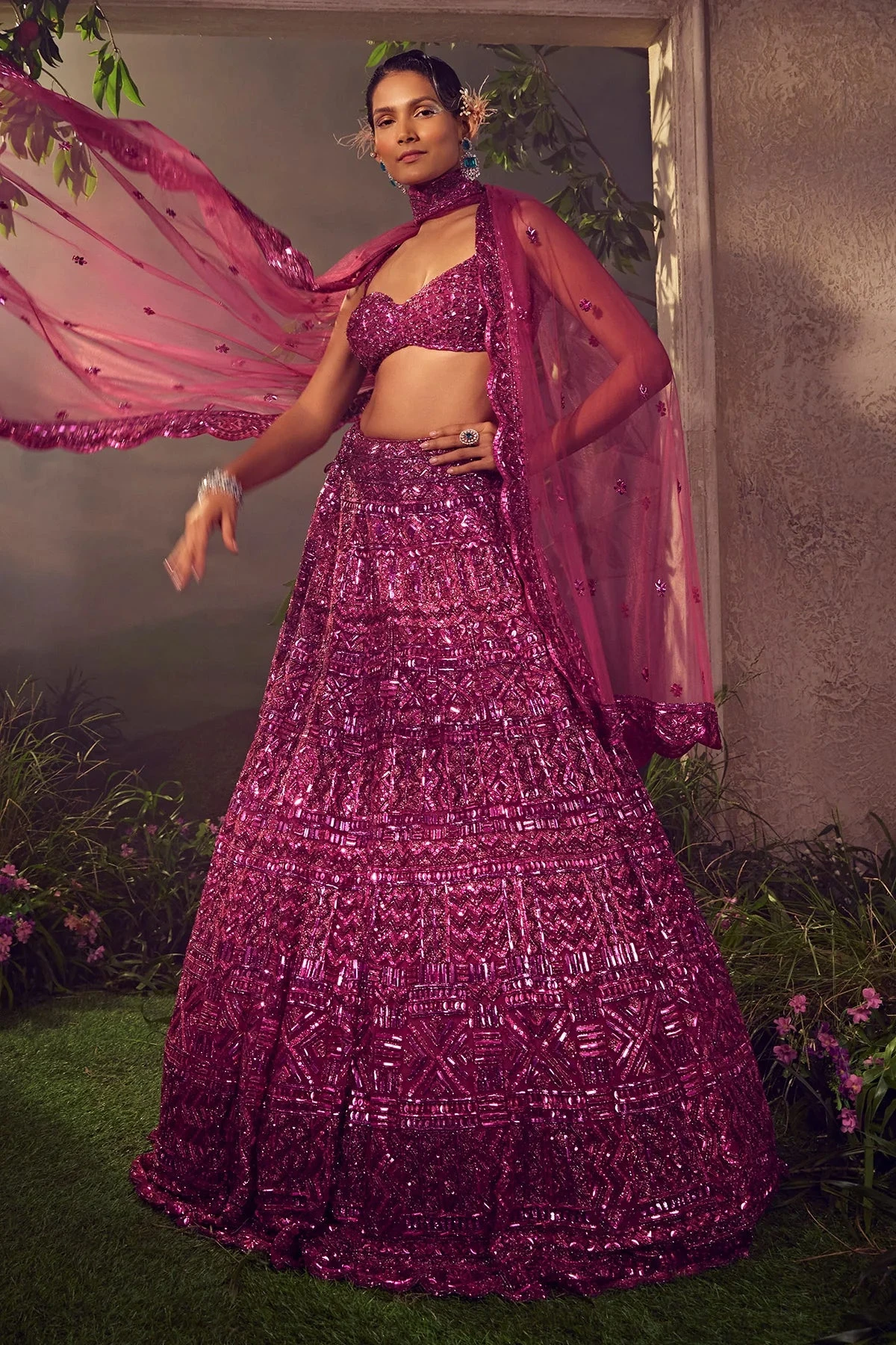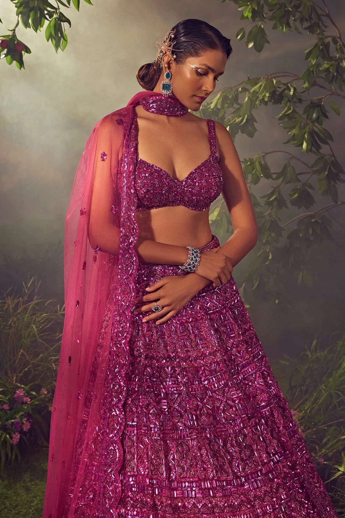 Featuring a magenta haze tulle lehenga embroidered fully by hand with various ornamental lustre sequences and Japanese bugle beads. It is paired with a scallop dupatta and a stylised blouse .