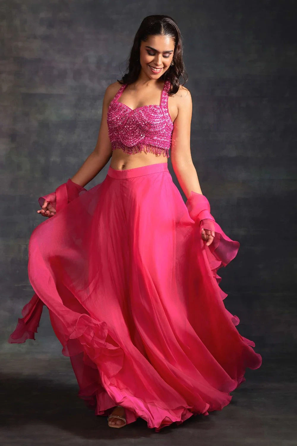 Embroidery on blouse, organza ruffle dupatta and divied lehenga. Embroidery: Multicolour machine thread work with hint of hand embroidery (katdana, crystal, sequins etc.)