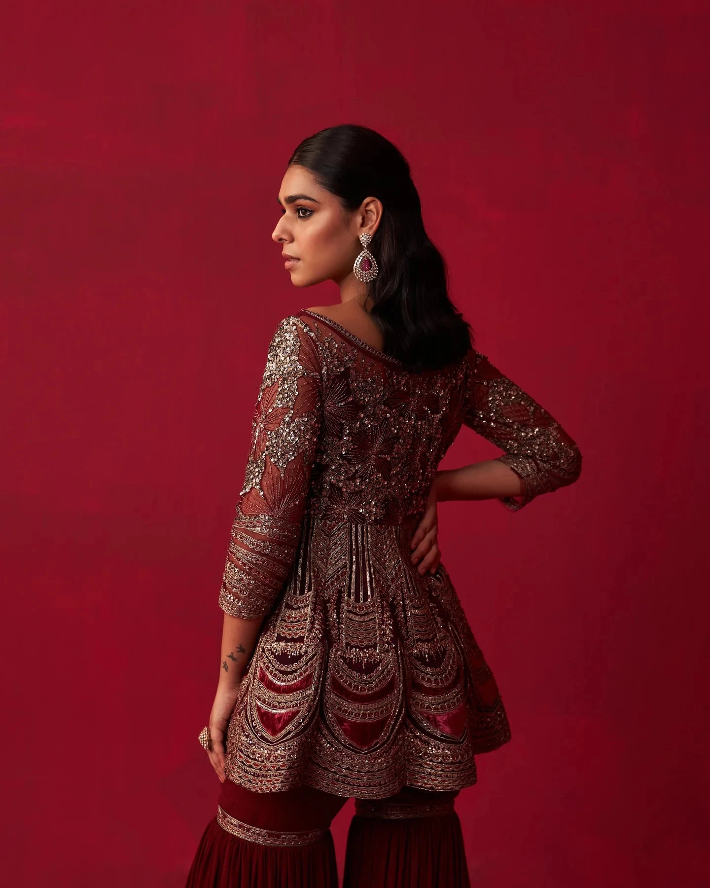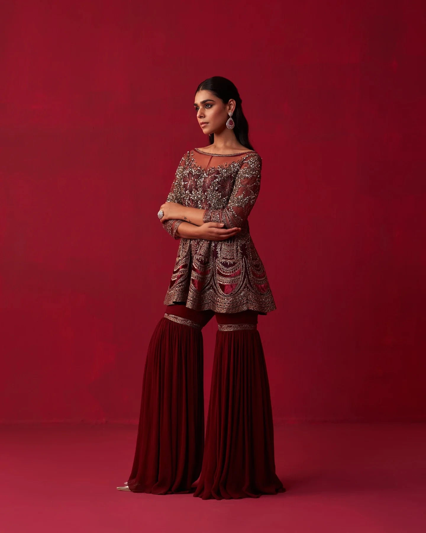 Maroon peplum style top with glitch gold embroidery. Comes with a georgette sharara and organza dupatta