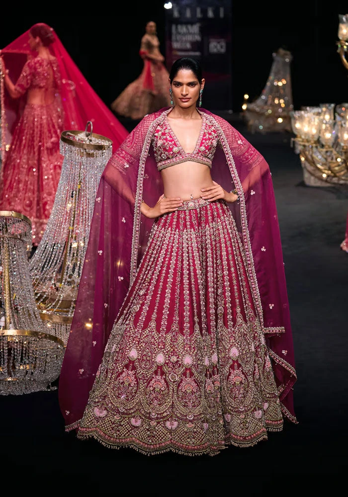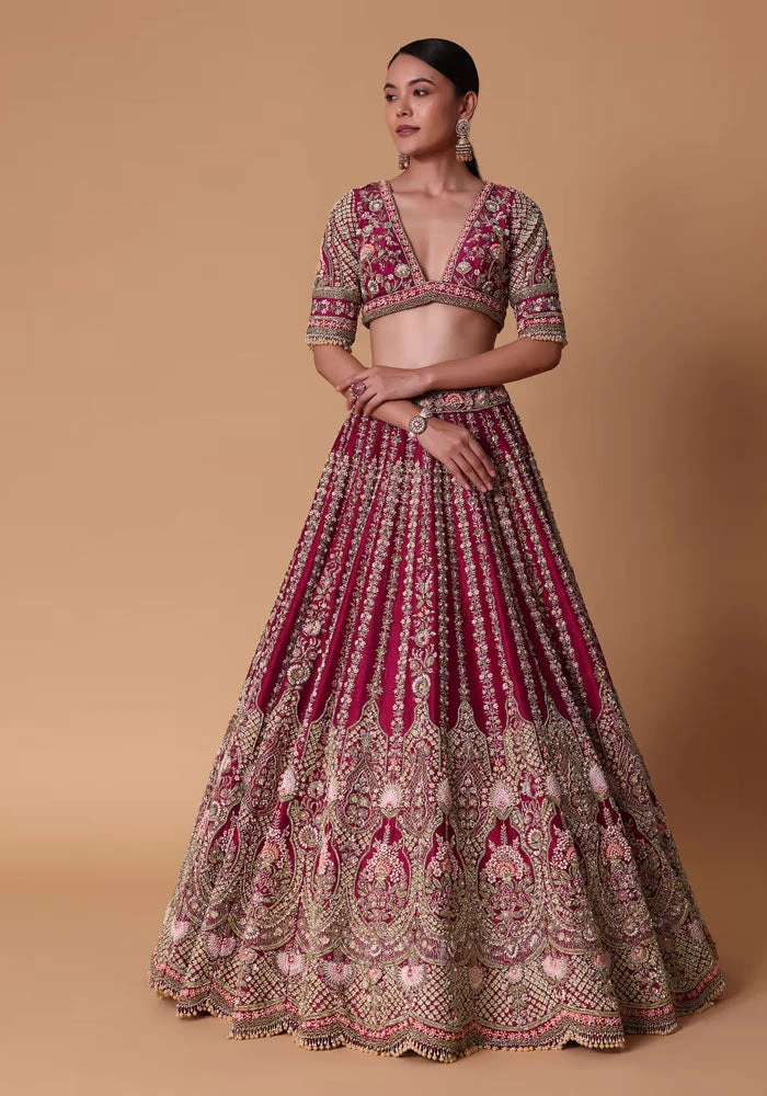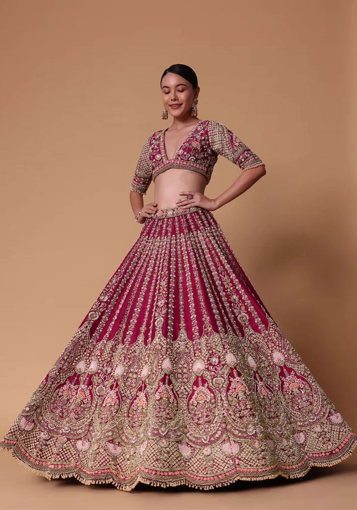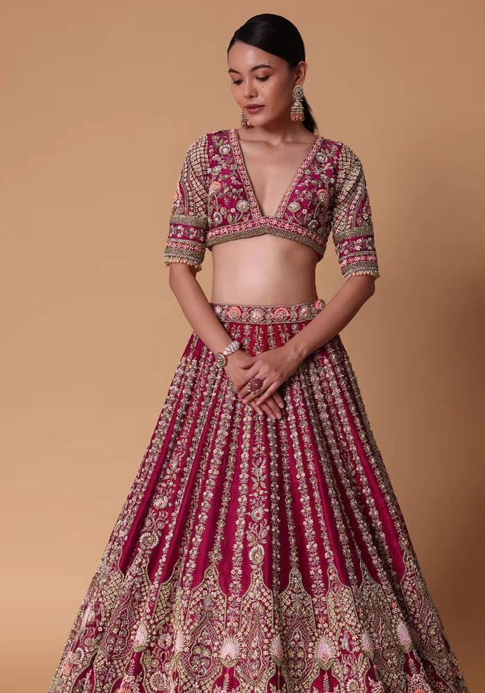 - Indulge in opulence with our maroon lehenga set that is completed with not just one but two whimsical dupattas.
