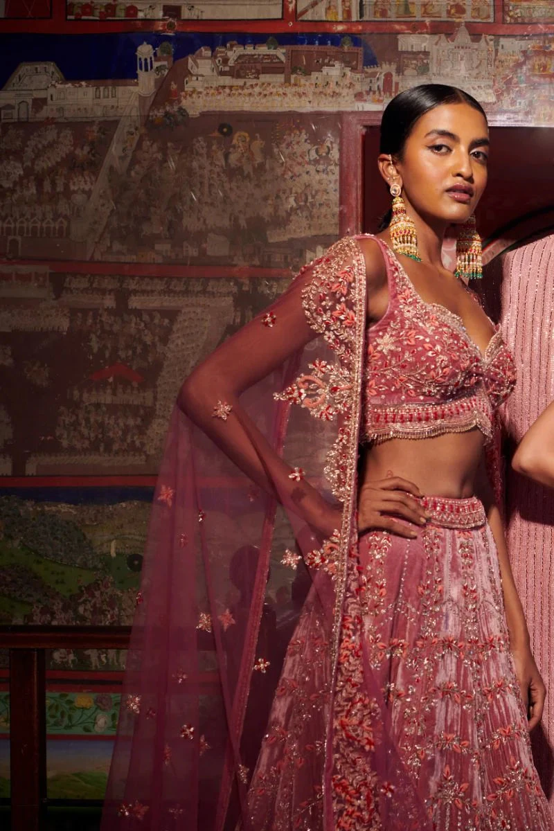 Generously pictured draped saree in mauve ornamental hand embroidery with ruffle details. Accentuated with a belt which makes this design a festive wardrobe keepsake.