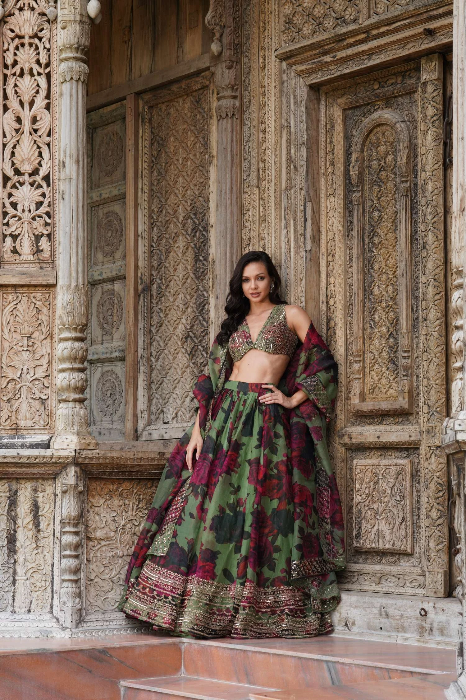 Featuring a Mehendi Green Floral Lehenga Set in Organza.