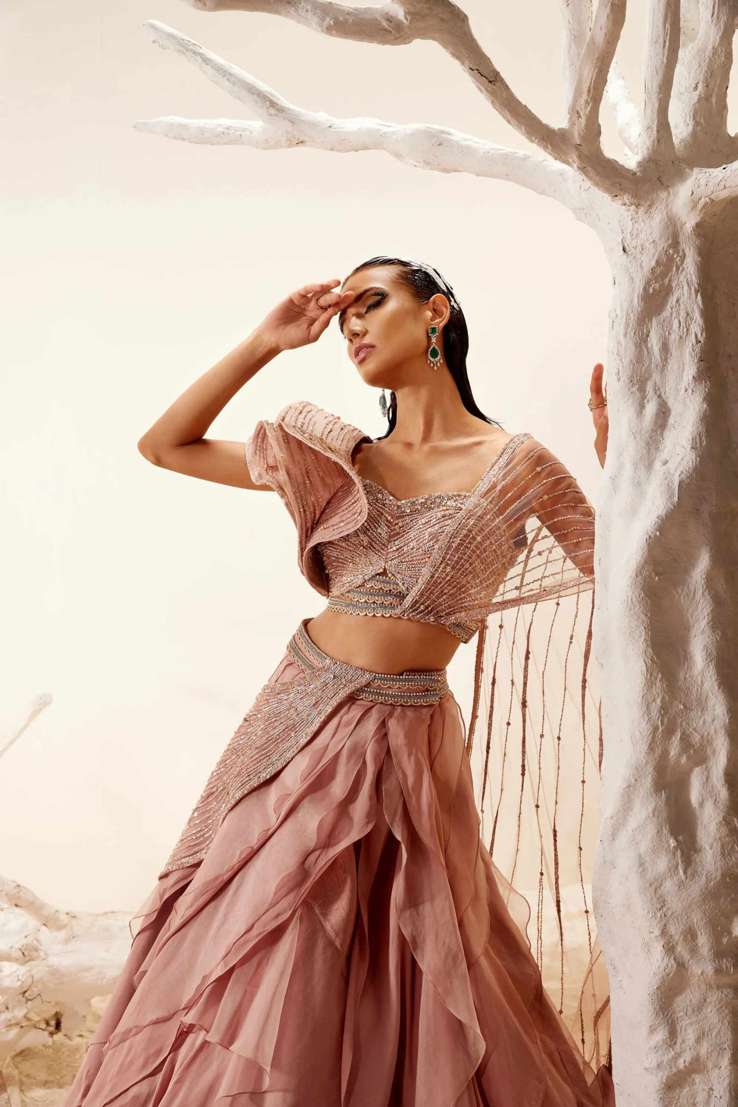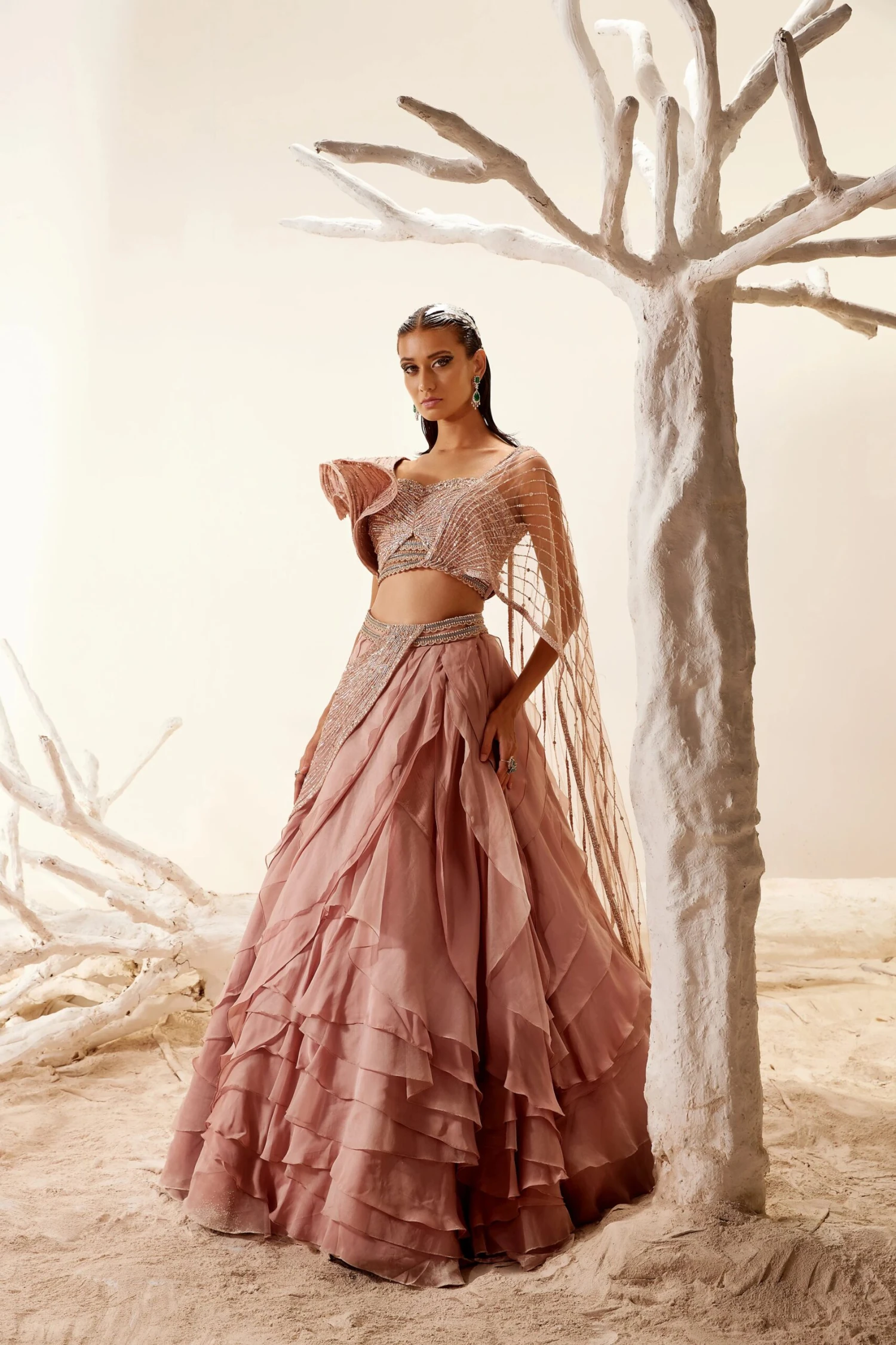 Rose gold hand embroidered blouse with bold metallic flap & attached drape. Paired with a layered lehenga.
