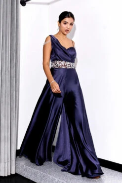 Midnight blue satin georgette jumpsuit with corset detailing at the waist. It has embroidered net at the waist and a drape at the yoke.