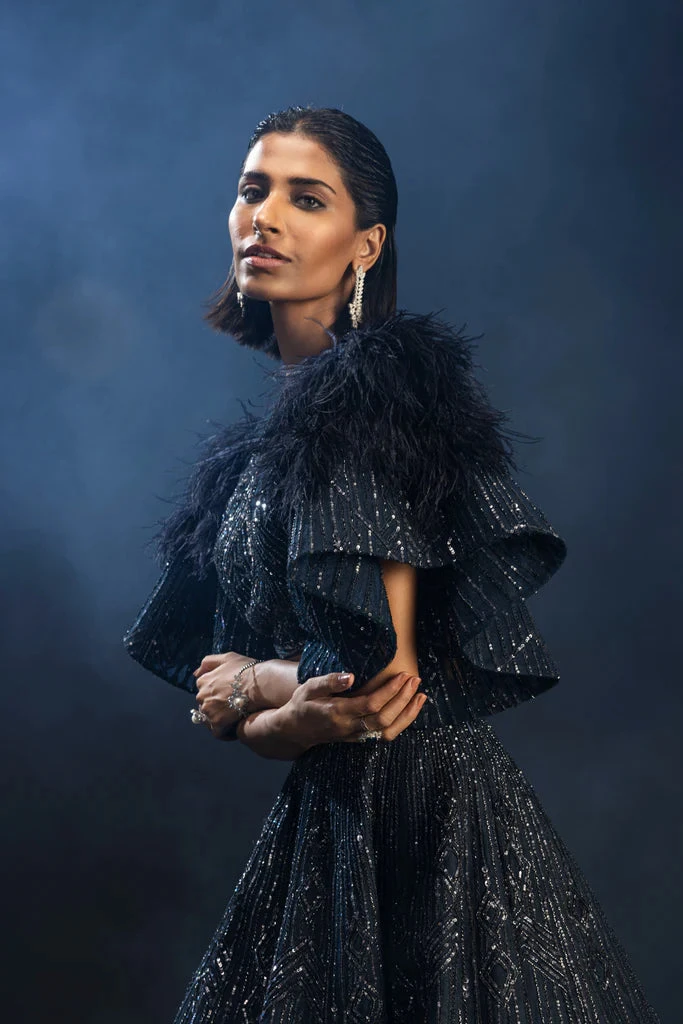 Midnight Blue drizzle embroidery Skirt, with elegantly sculpted sleeves, having dramatic feather details on the shoulders.