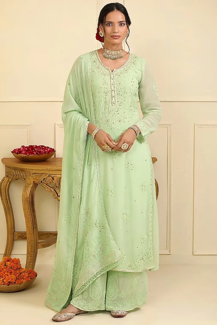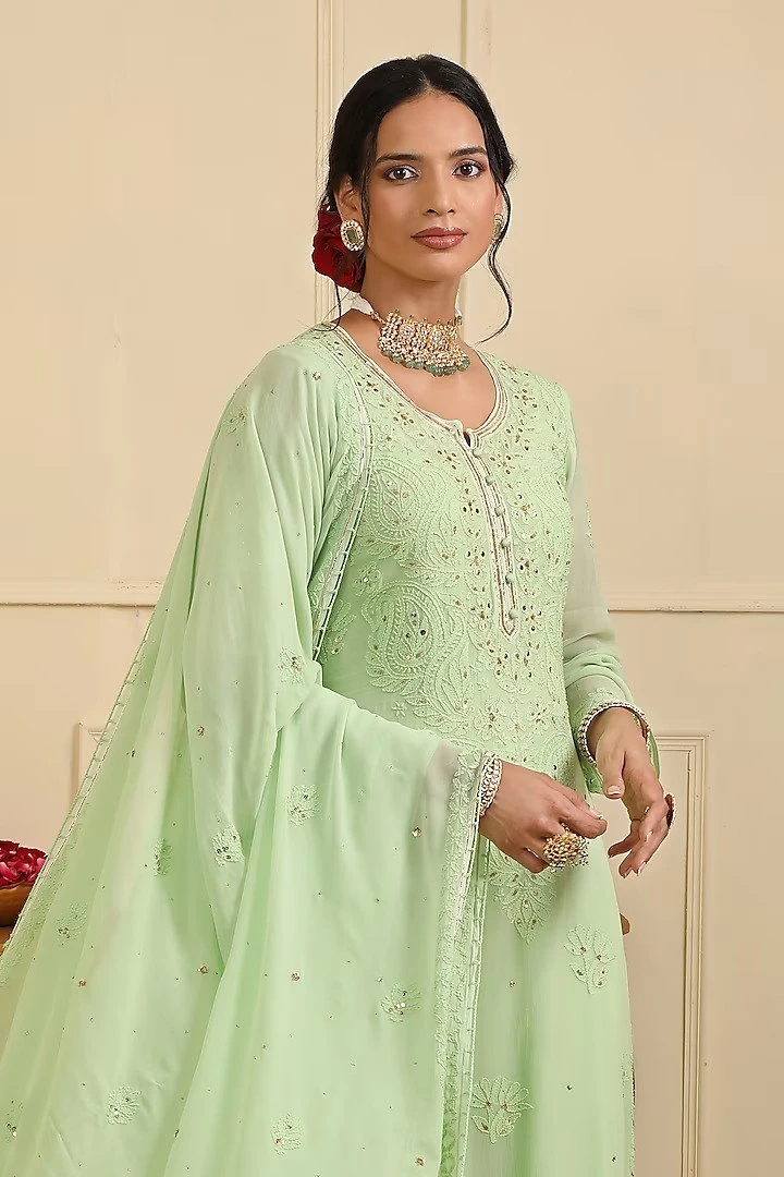Featuring a mint chikankari kurta in georgette base with sequins, mukaish, and gota embellishments. It is paired with matching pants and a dupatta having sequins and gota embellishments.