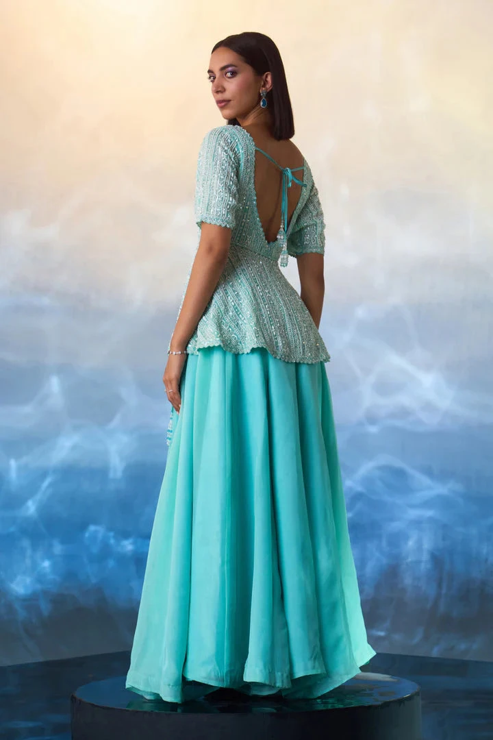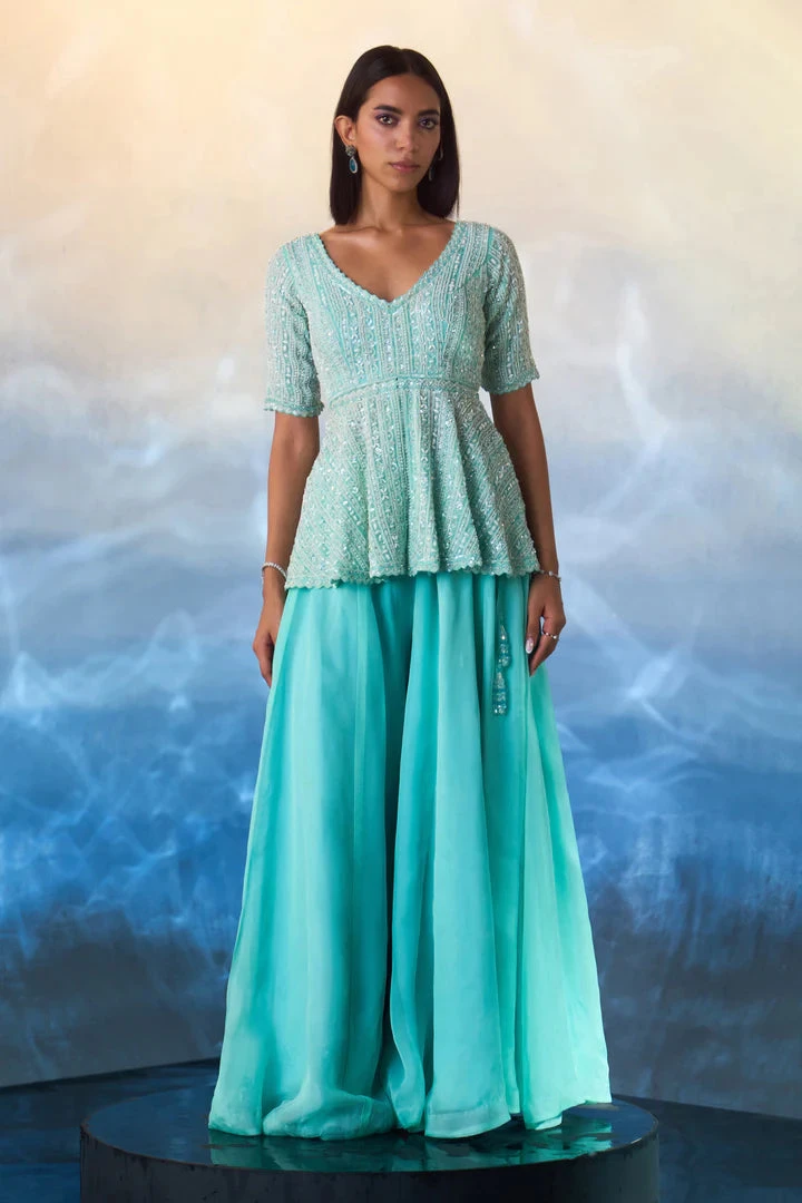 A mint green peplum embroidered with pearls, sequins, crystals and bugle beads paired with an organza sharara.