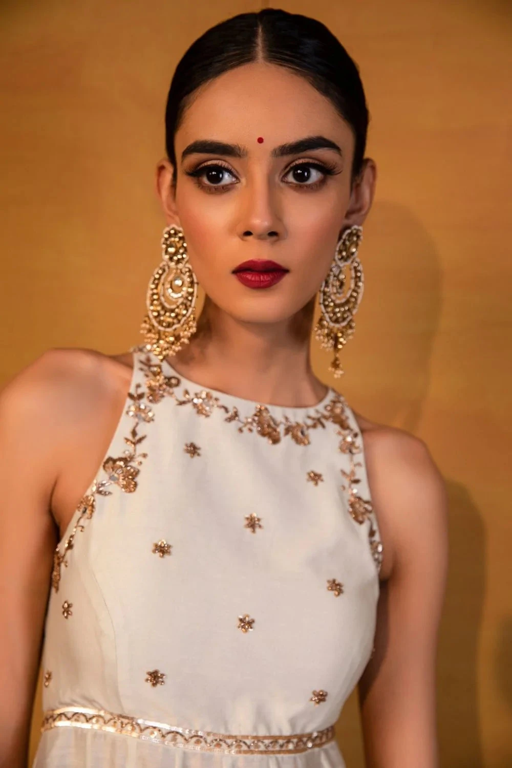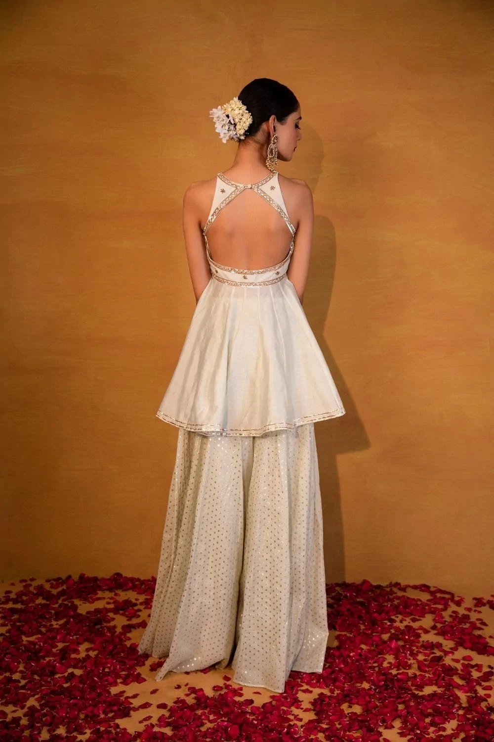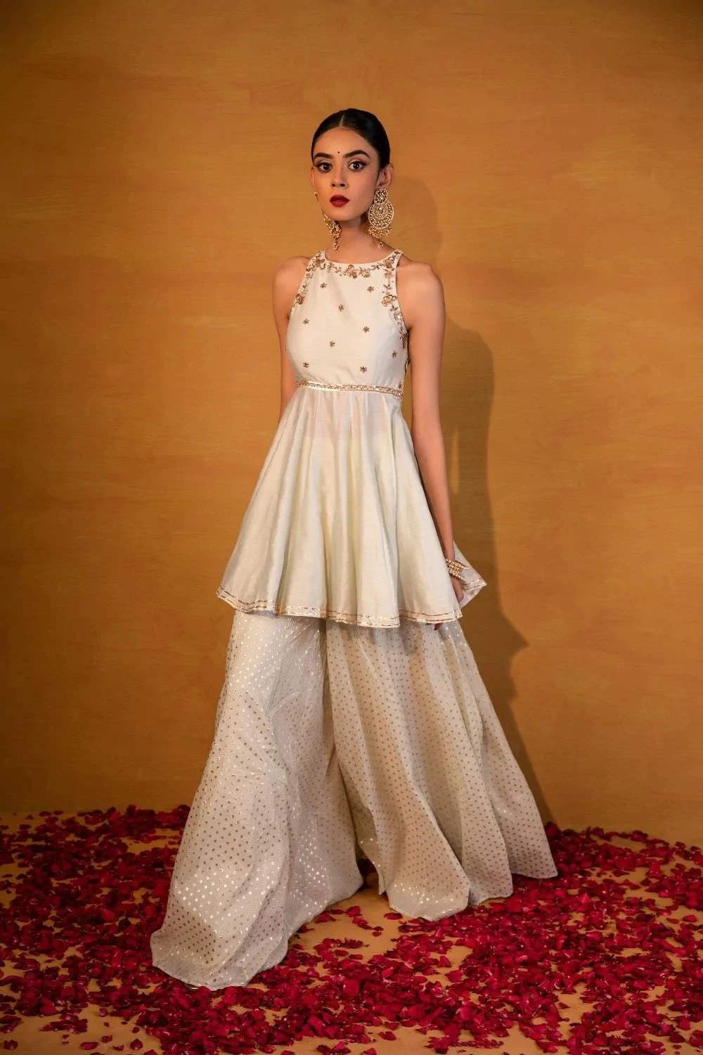 Mint textured chanderi flared palazzo. Paired with Anarkali style short kurta embellished with gota, nakshi and sequins.