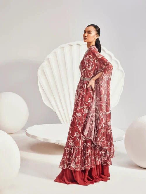 With flickering fluid renditions and craft-centric breezy couture, MOANA Cape Set is unified by the apex craftsmanship of a printed one-shoulder cape, hand-embellished blouse, and solid tiered skirt.