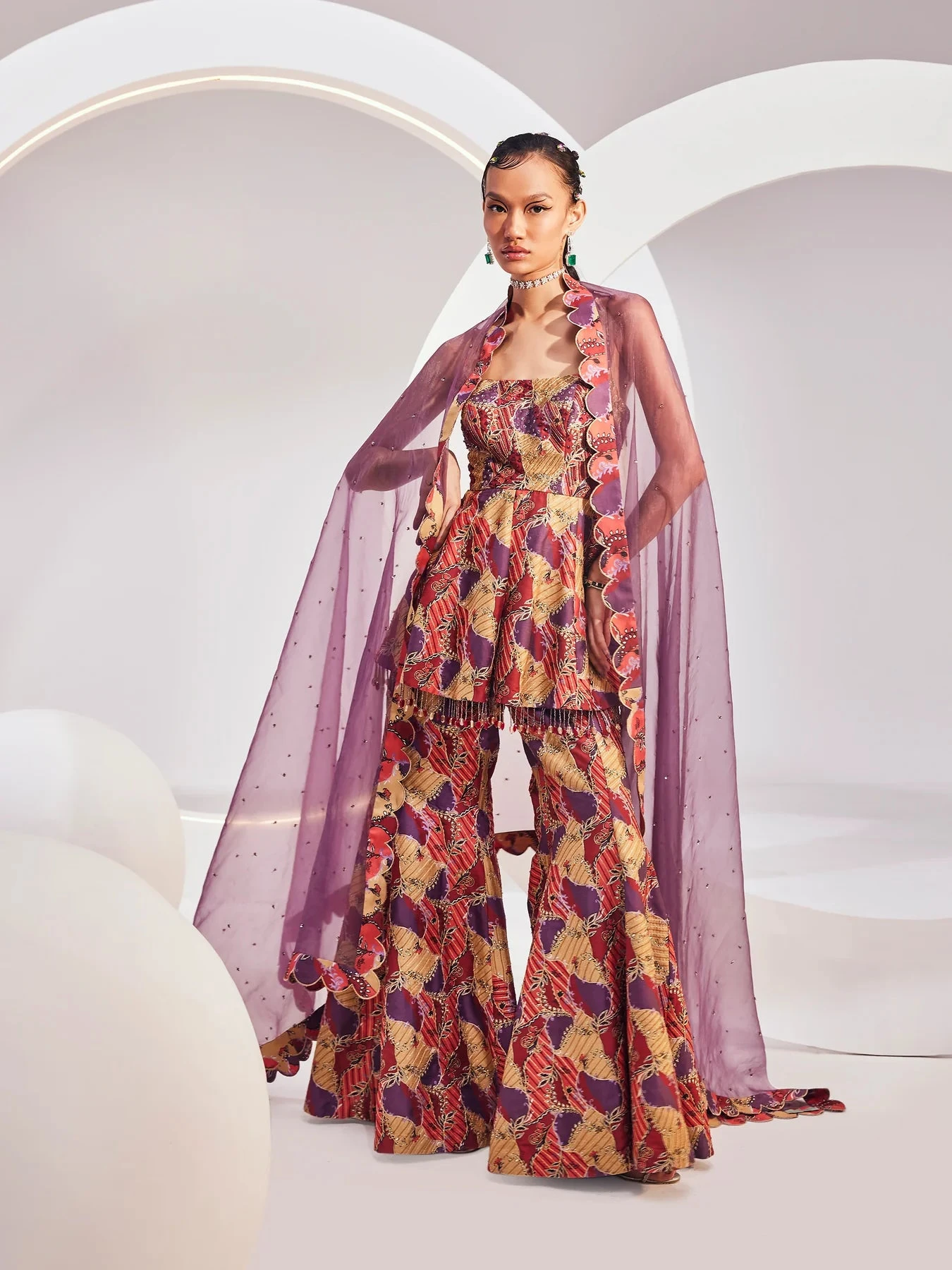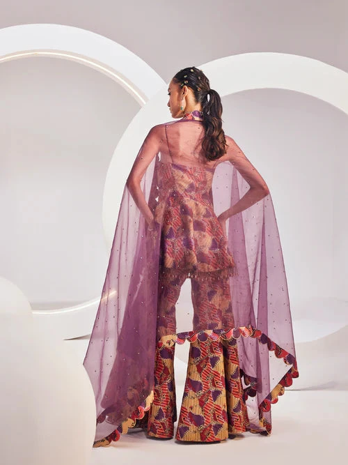 Vibrant, Opulent, Modern! MOLLY Sharara Set calls for everything elegant and urbane with its accentuating prints and statement embellishments. Highlighting the prints in every manner, the sharara set comprises of printed kurti, sharara, and scalloped dupatta with adornments.