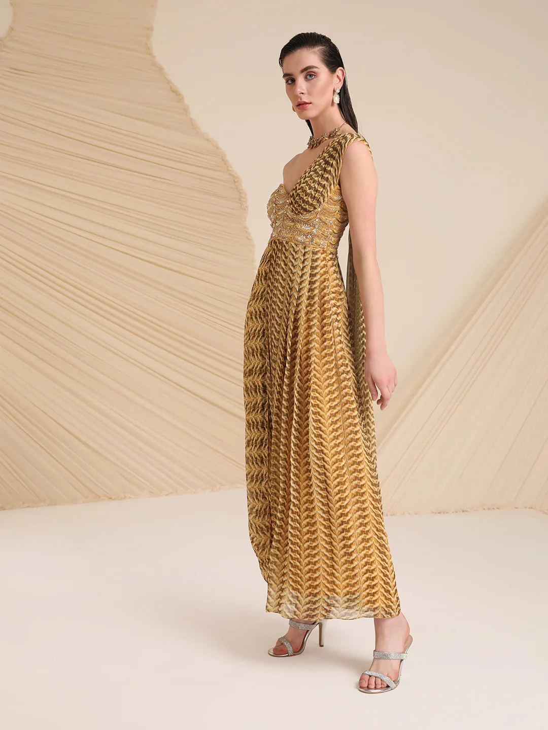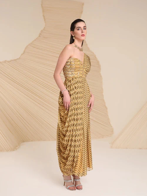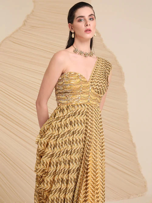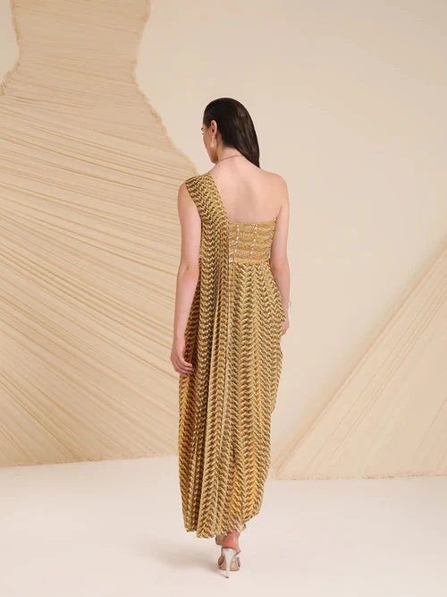 Meticulously crafted by our artisans, the cowl detailing and waist embellishment highlight our Monroe dress. The flowy pleats and A-symmetrical silhouette enhances it for the season of celebrations.