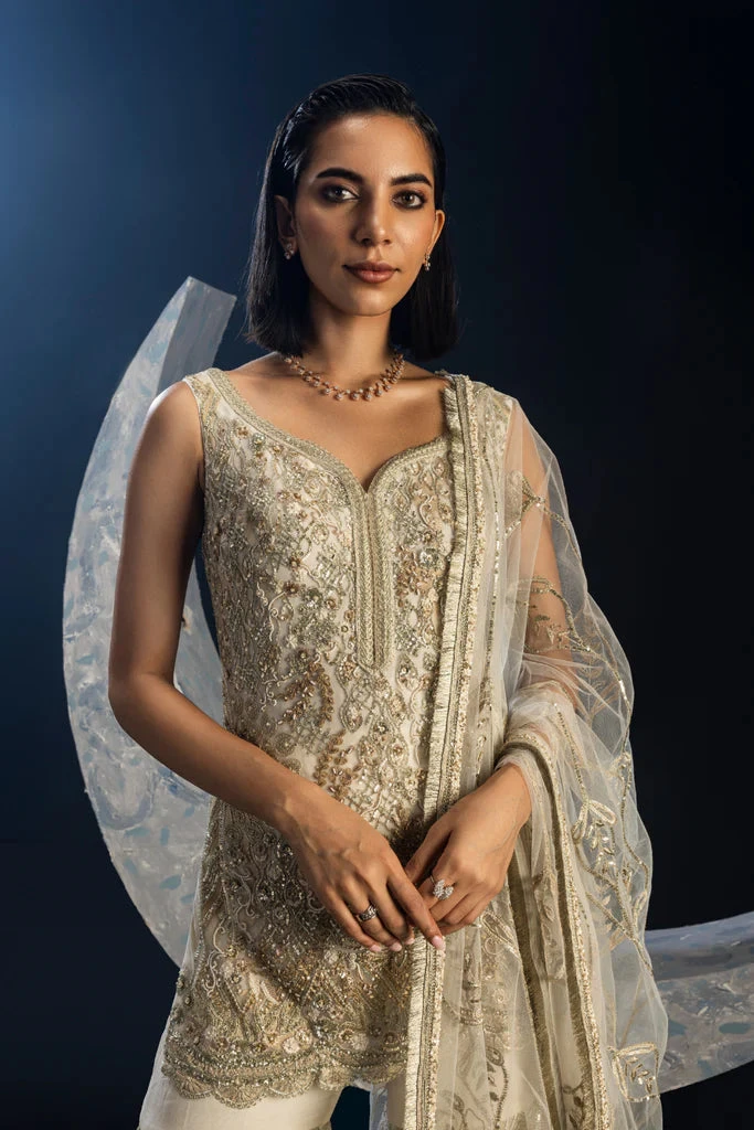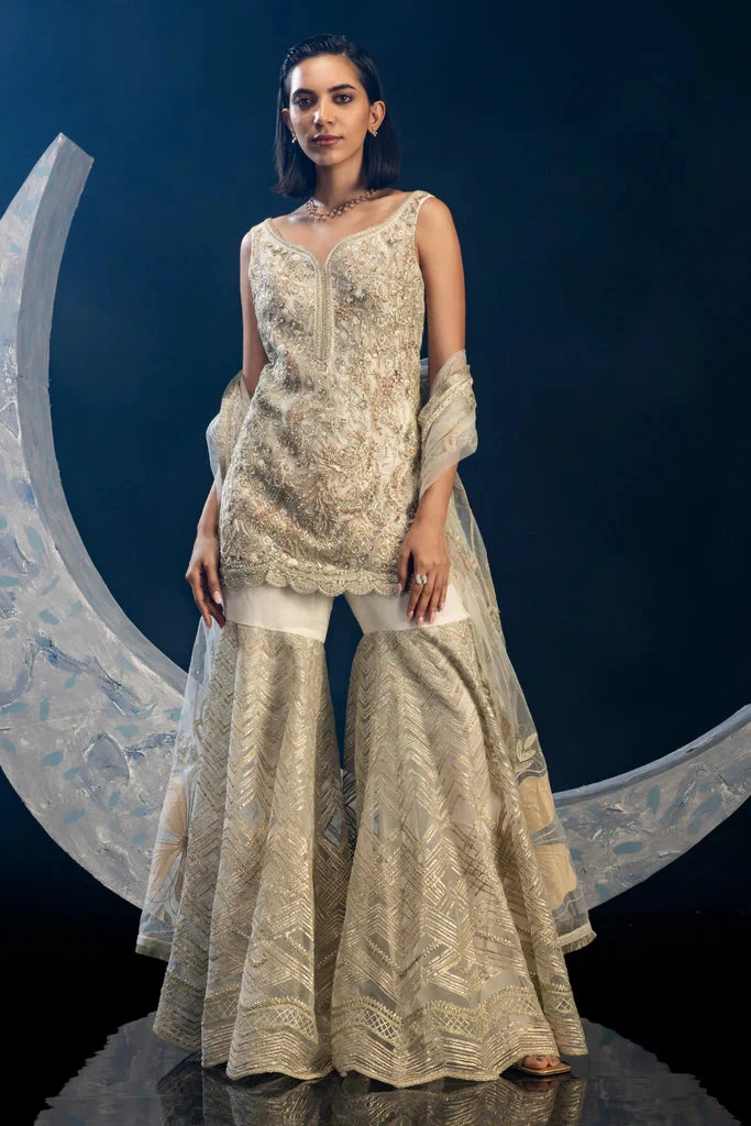 Radiant swirl embroidered kurta with scalloped hemline, paired with a radiant sharara, and a dupatta.