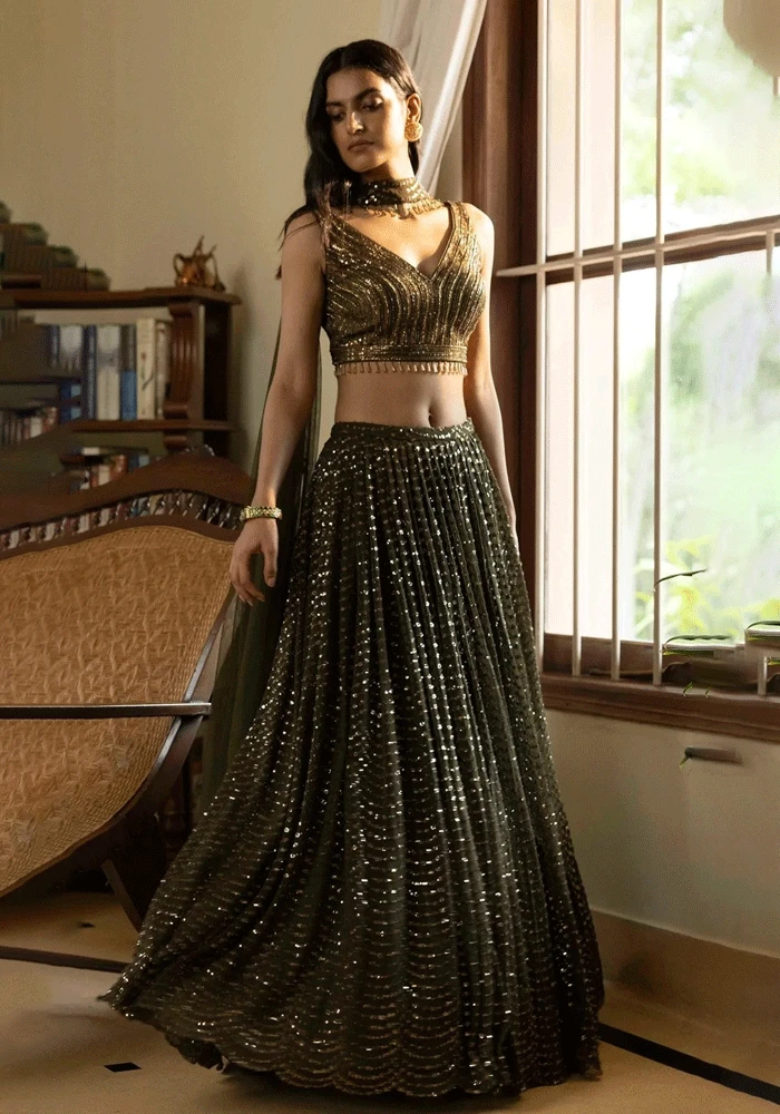 Moss green sequinced lehenga Set With deep V neck Blouse is Modern and fashionable.. Blouse is based on raw silk fabric and is designed in a modern neckline with with sequins all over. Hem of the blouse has hanging tassels. The Shimmery lehenga skirt on sequinced lycra has volumionous fairy like effect and is completed with soft net necklace dupatta in complementing colour. Garment is chic and sophisticated. Style them up with statement earrings to complete the look. The ensemble is perfect for wedding or evening soirees you need to attend. . Slight variation in color is possible due to digital photography. Being an authentic brand we deliver the same styles as shown on the website.