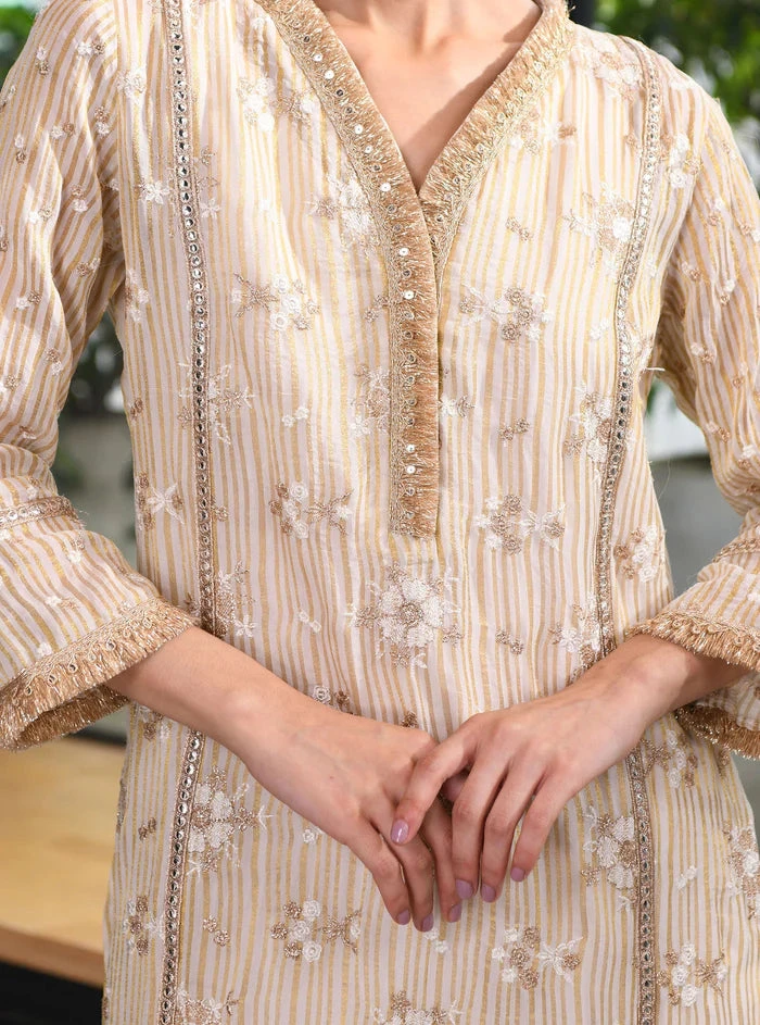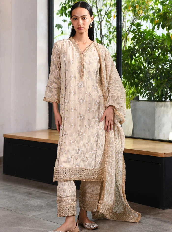 - This Banarasi organza straight kurta has a Y-neckline with panelling in front. The kurta has zari and white buti embroidery all over with mirror gota inserts on the kurta and sleeve panel joint.