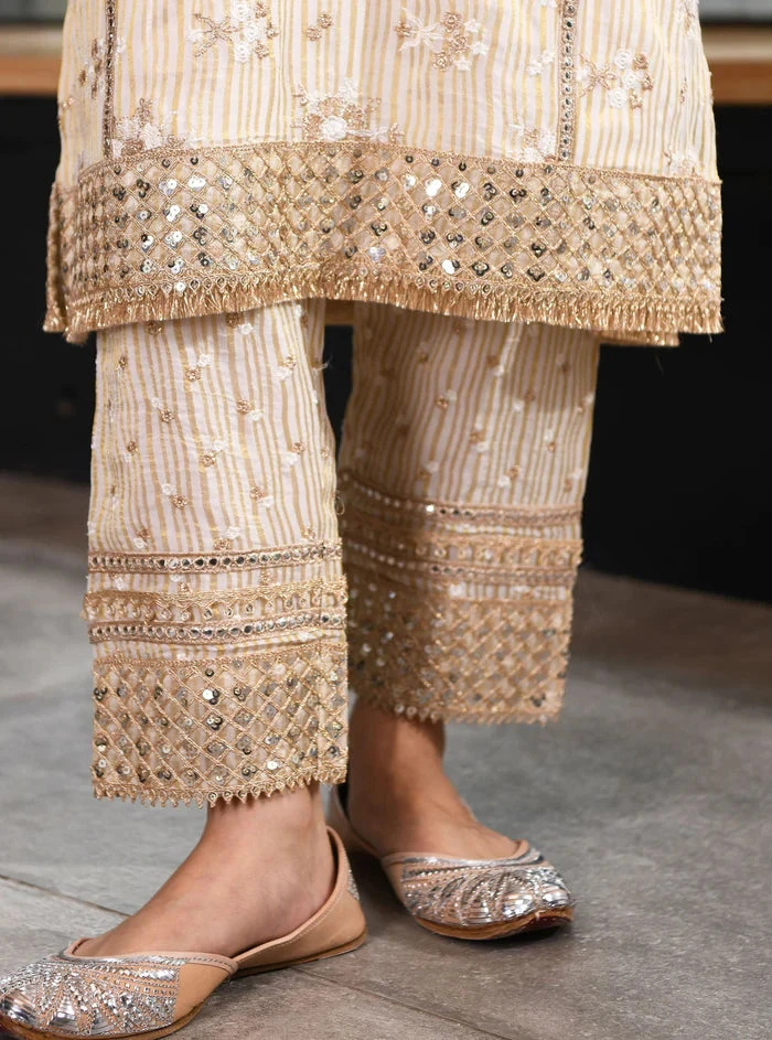 - The pants have small buti embroidery in zari and white all over. Adorned with broad sequins gota and mirror gota at the bottom.