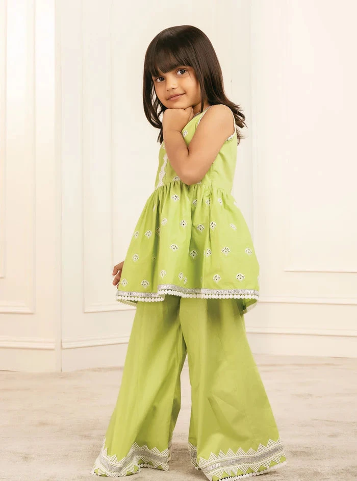 Embellished round V cut neckline with silver gota & cotton lace