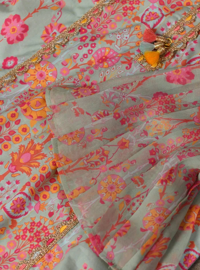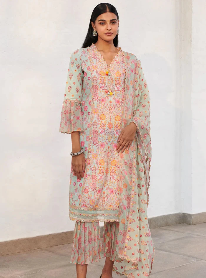- Complete the look with matching organza dupatta with buti embroidery and a printed border.