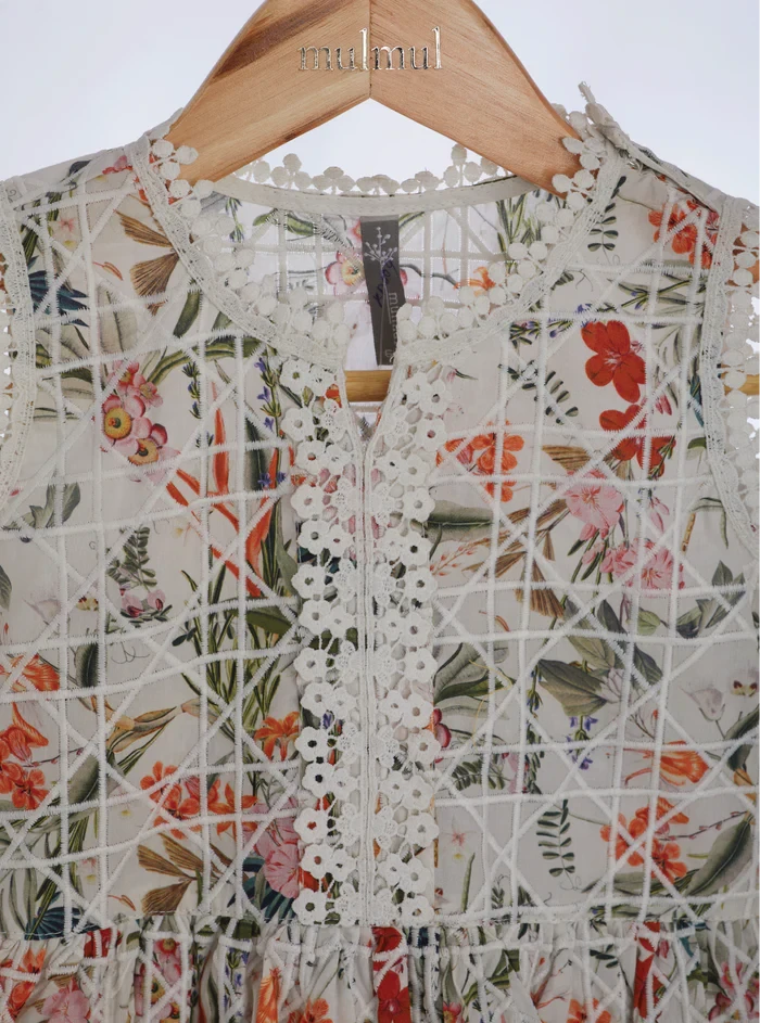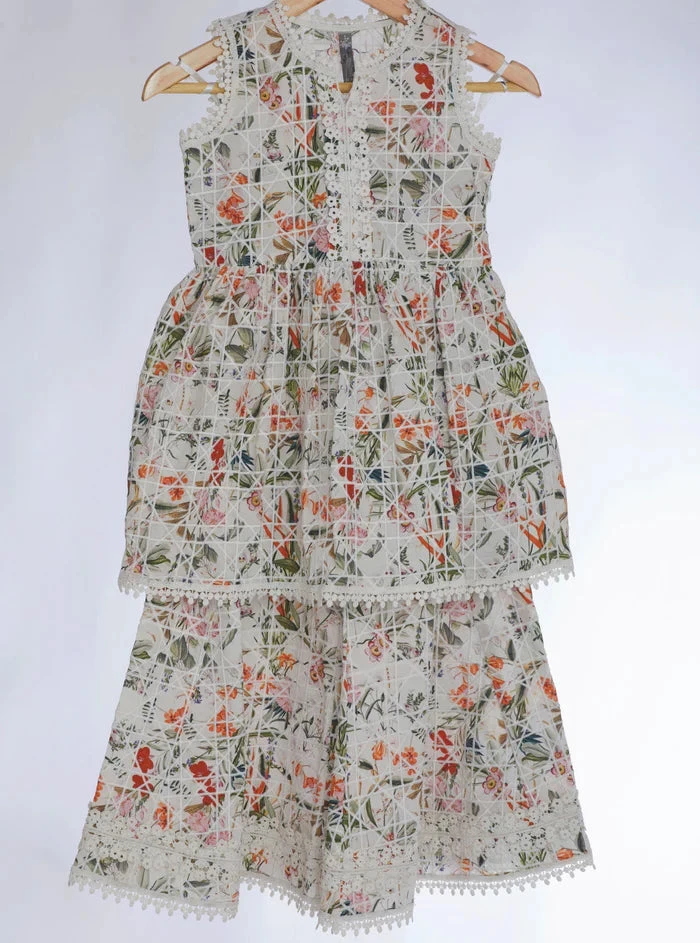 A galore of prints, the Liz set in pure Mulmul cotton comes in a peplum style sleeveless top with matching garara bottoms.