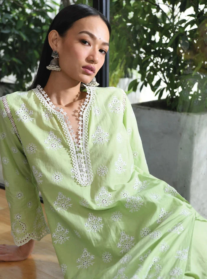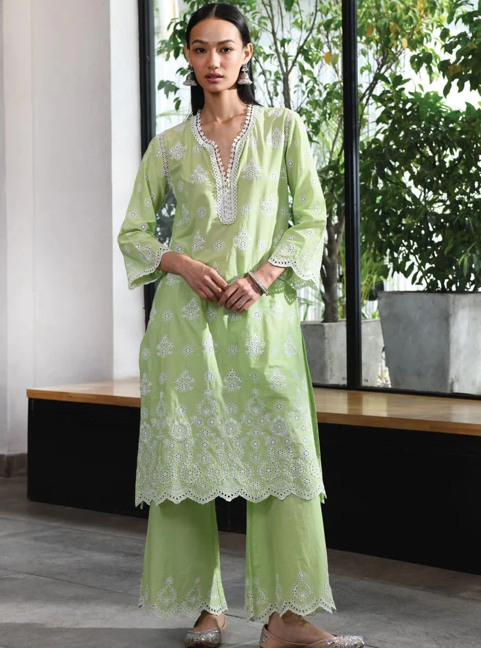 – Complete the look with cotton dupatta with scallop edges, buti embroidery and broad floral laces on its edges.