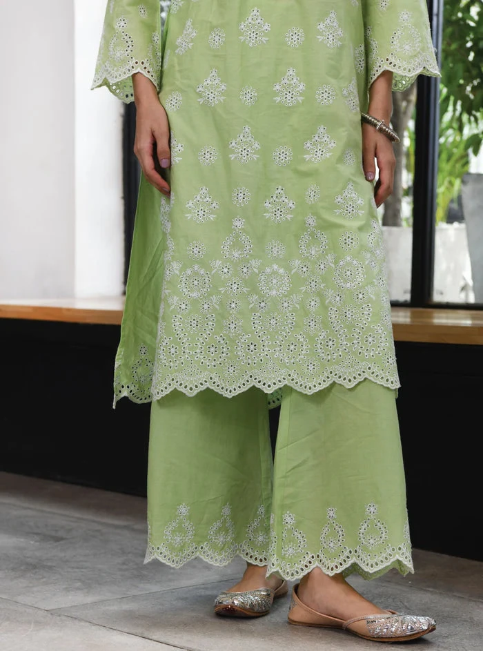 – This cotton suit set has a beautiful sciffli border. It has buti embroidery on a green base. Embellished with laces.