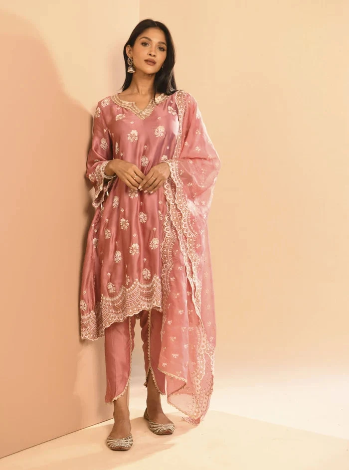 This sophisticated mauve straight kurta and dhoti pants set is an elegant option for festive celebrations. Crafted from lightweight and delicate satin, this ensemble offers both comfort and style. This set effortlessly combines traditional elements with modern design, making it a perfect choice for those who seek both comfort and elegance during special occasions.
