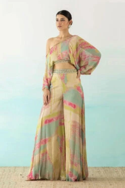 Multi color hue palazzo set with one shoulder crop blouse is posh and fashionable.