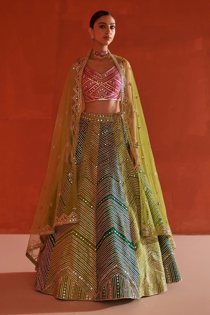 A raw silk lehenga made with two shades of green using gota and mirror work.
