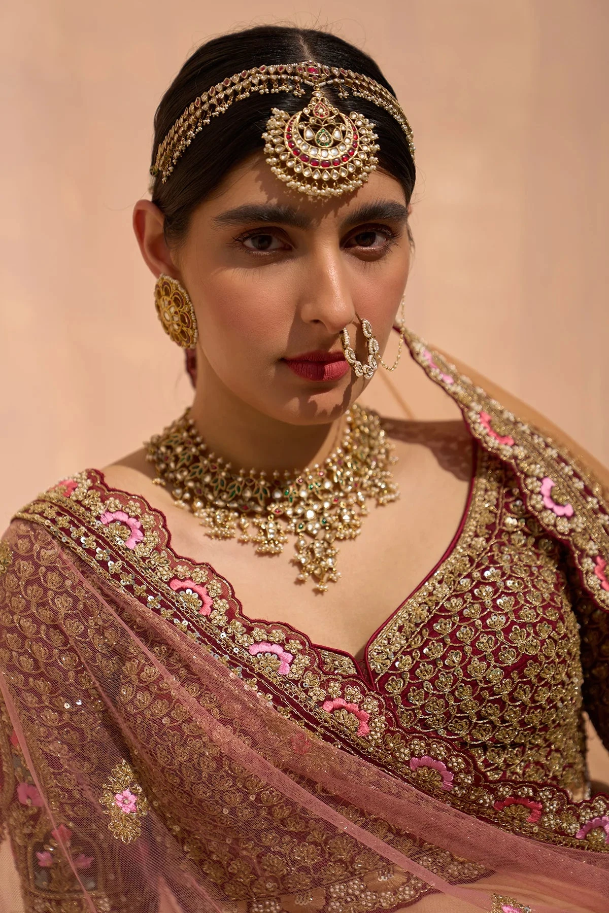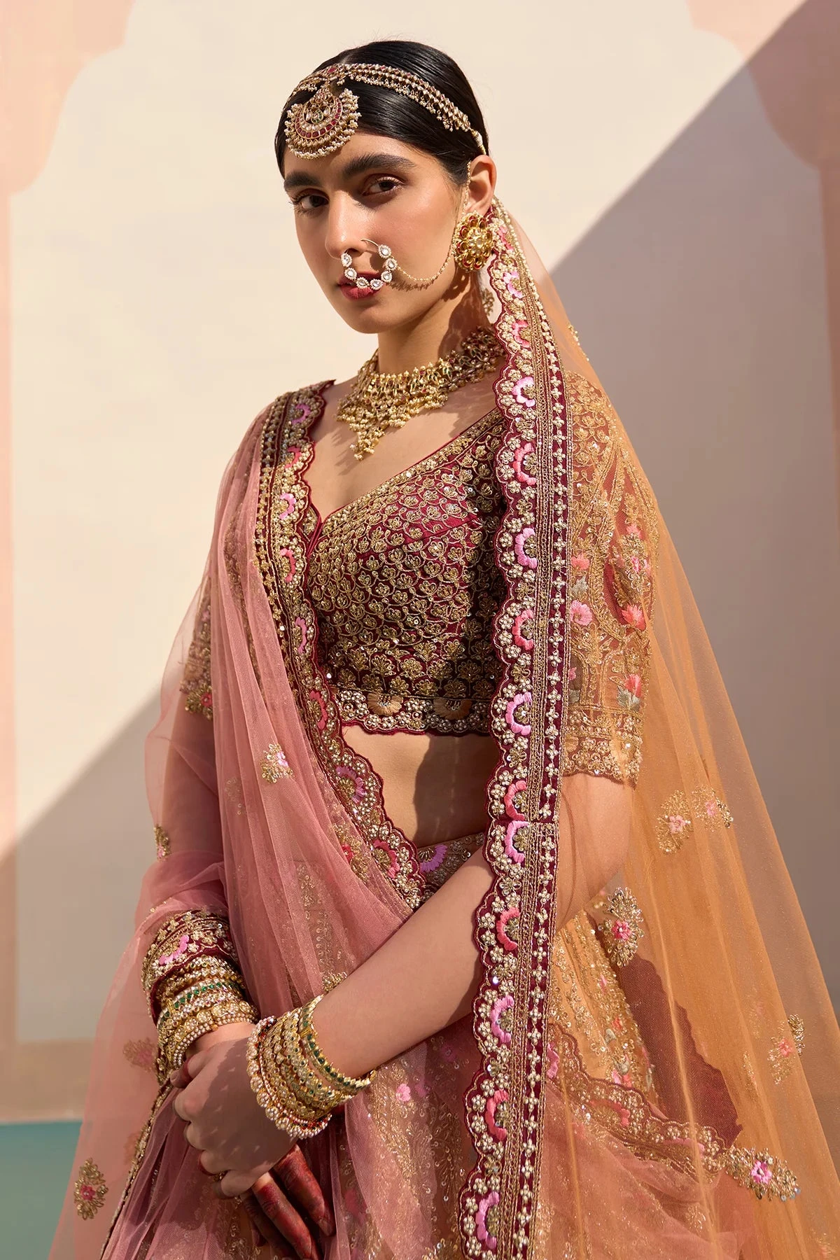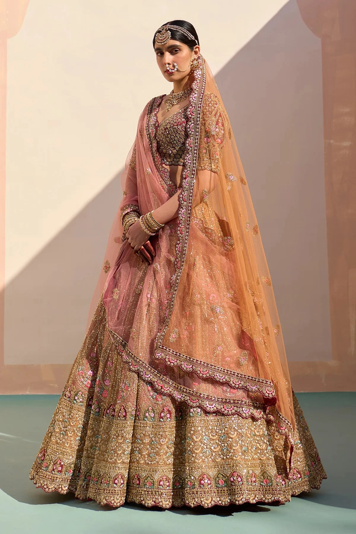 A mustard organza double dupatta lehenga set embroidered with the traditional zardozi technique using silken threads, dabka, cutdana and sequins under layed with multi-coloured organza appliques.