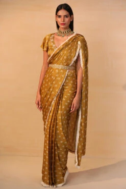 Mustard pre-stitched saree with floral printed motifs. Paired with embroidered frill blouse & embroidered belt.