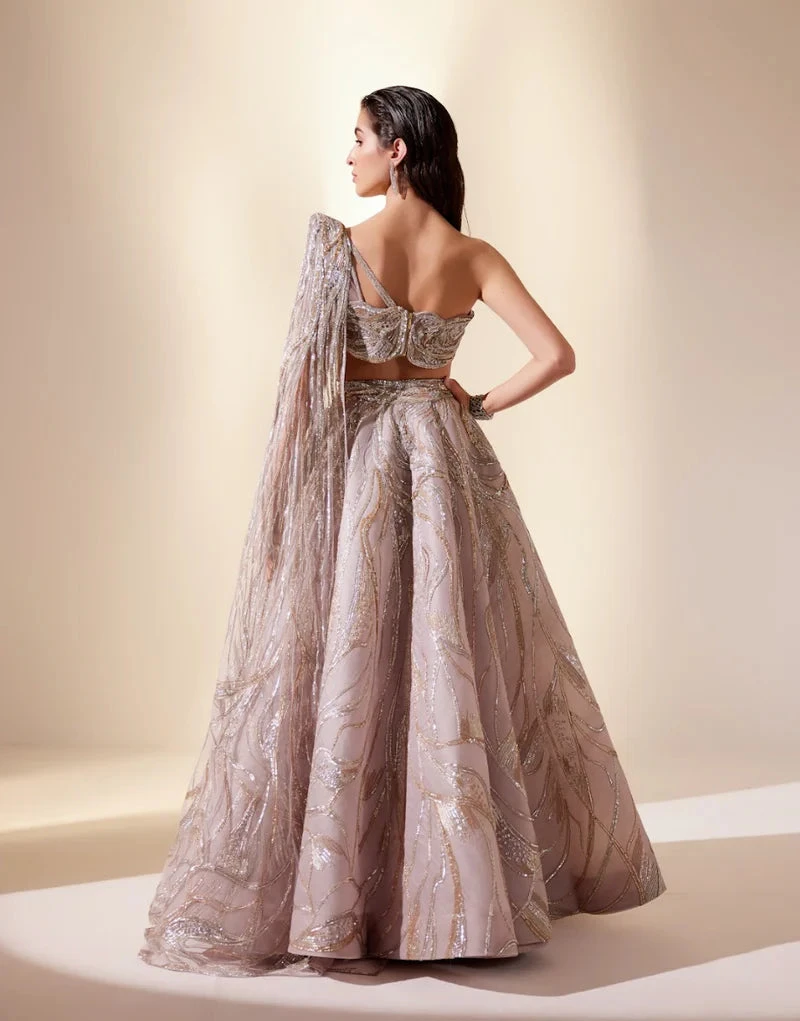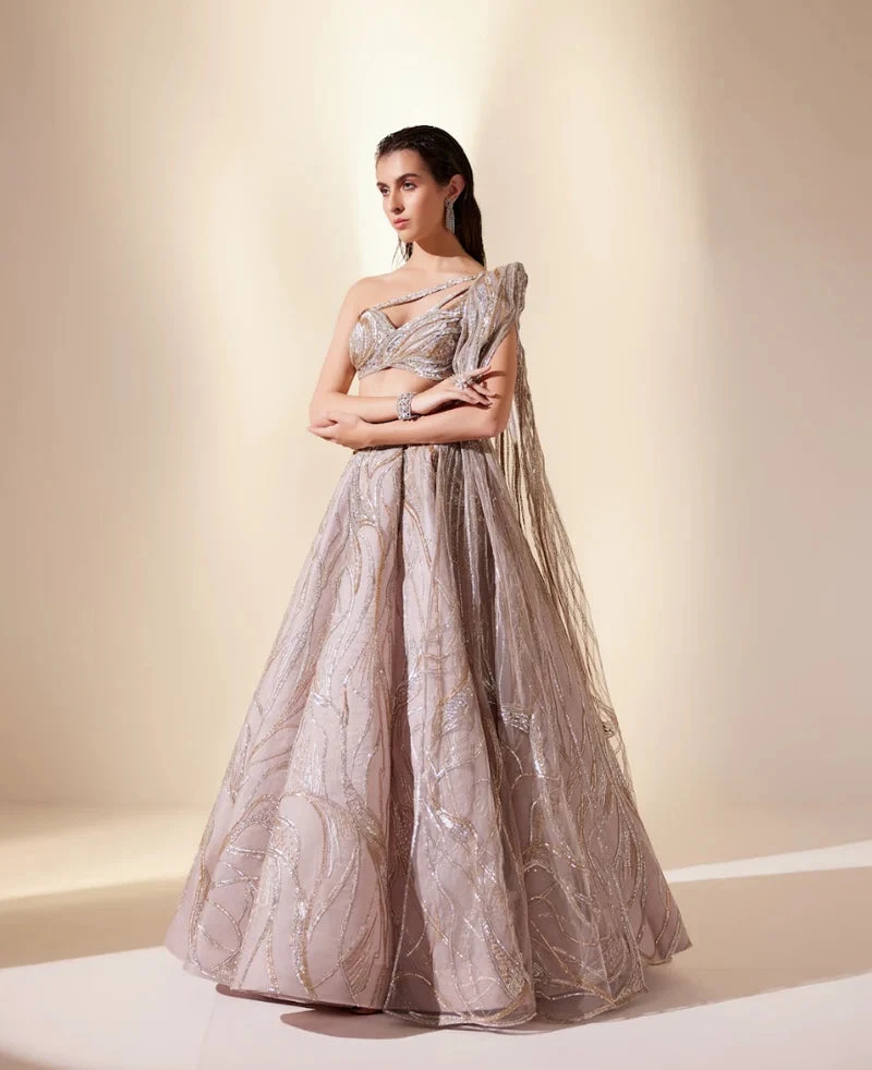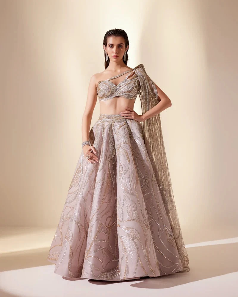The flowing lehenga, paired with a matching blouse featuring delicate work and corsages on shoulders with brimming dramatic drapes.