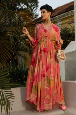 A bohemian inspired creation in a hint of blush. This naksha printed kaftan set is high on style and comfort, the one-size-fits-all silhoutte featuring drawstring tie-ups with tassel detail, sprinkled with mirror, sequins, cutdana and zari, V-cut neck with hand tucked cowrie shell detailing to brought in a bohemian vibe.