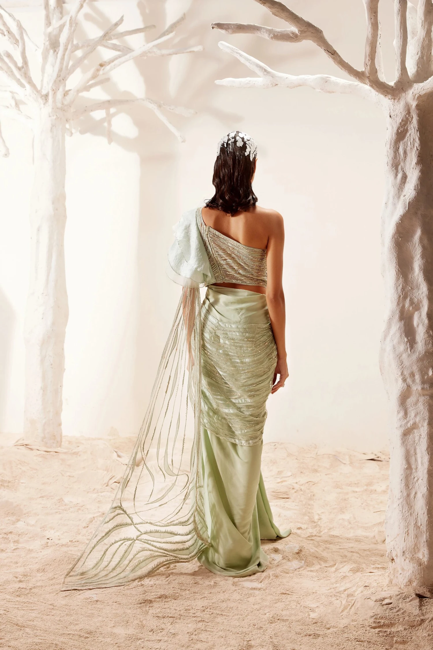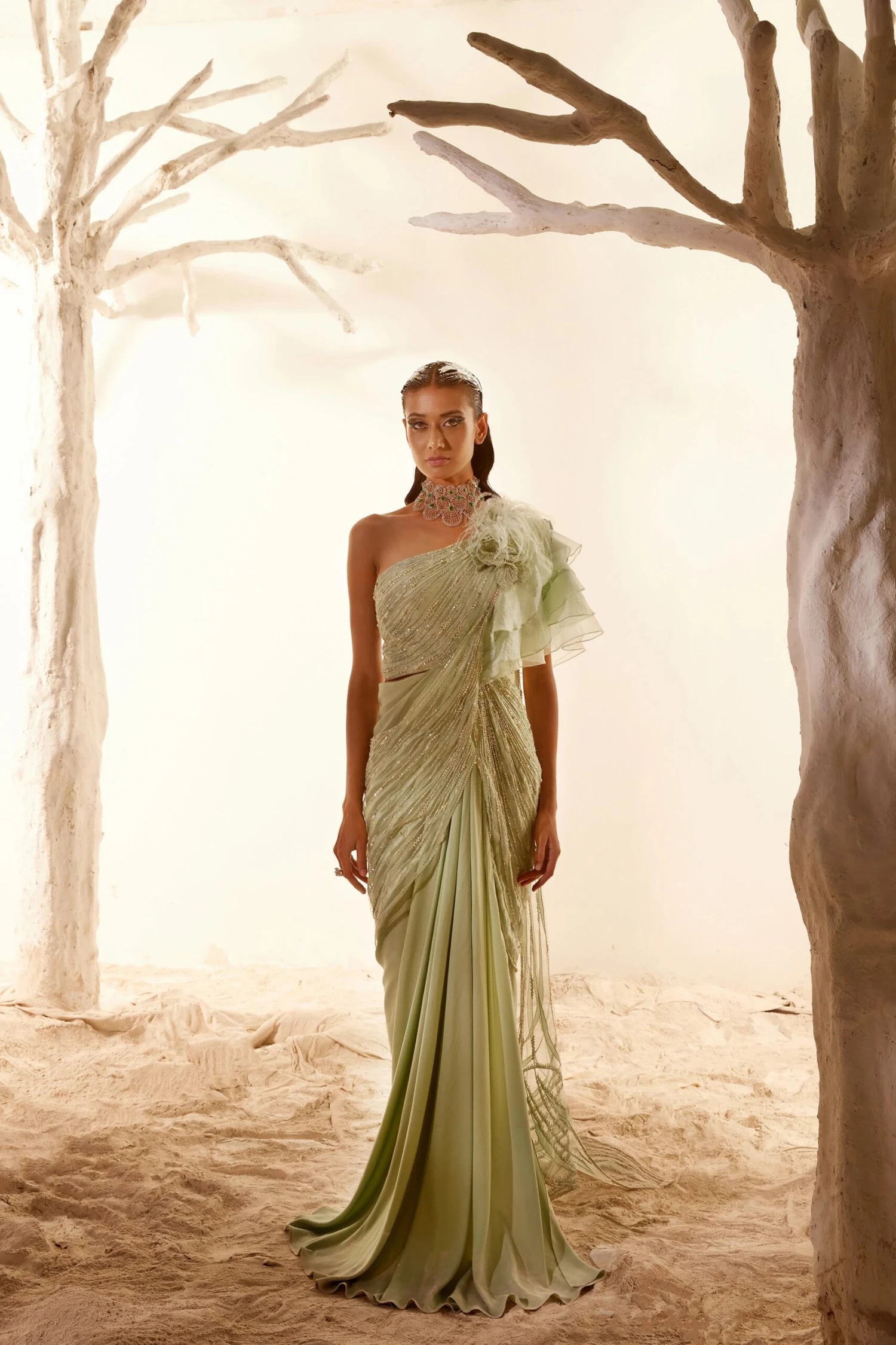 Nile green saree gown with hand embroidery, gilded corsages on shoulders & side slit.
