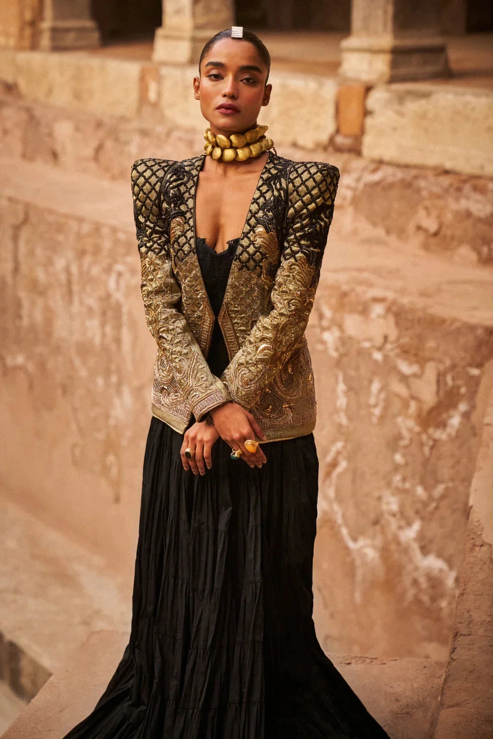 This Odyssey Trail Blazer & Skirt Set offers exquisite craftsmanship in a designer ensemble. The golden lurex blazer is fully lined with single hook fastening, and its exaggerated shoulders are adorned with golden zari dabka Zardozi embroidery. The coordinating tier skirt has a full circle silhouette and secure zipper fastening with fixed belt.
