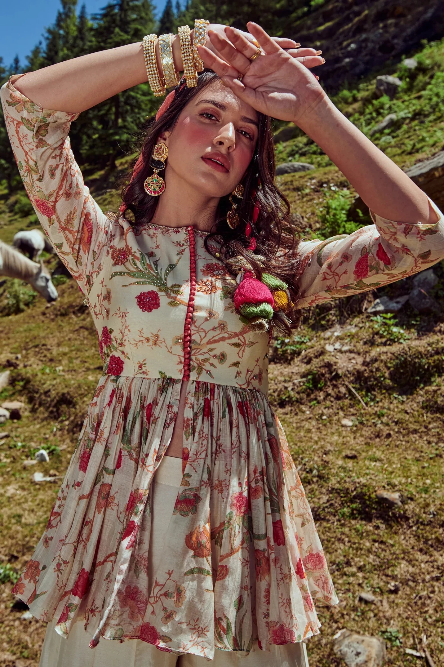 An off–white floral print peplum top embellished with sequins, french knots, moti and resham thread work paired with off white palazzos.