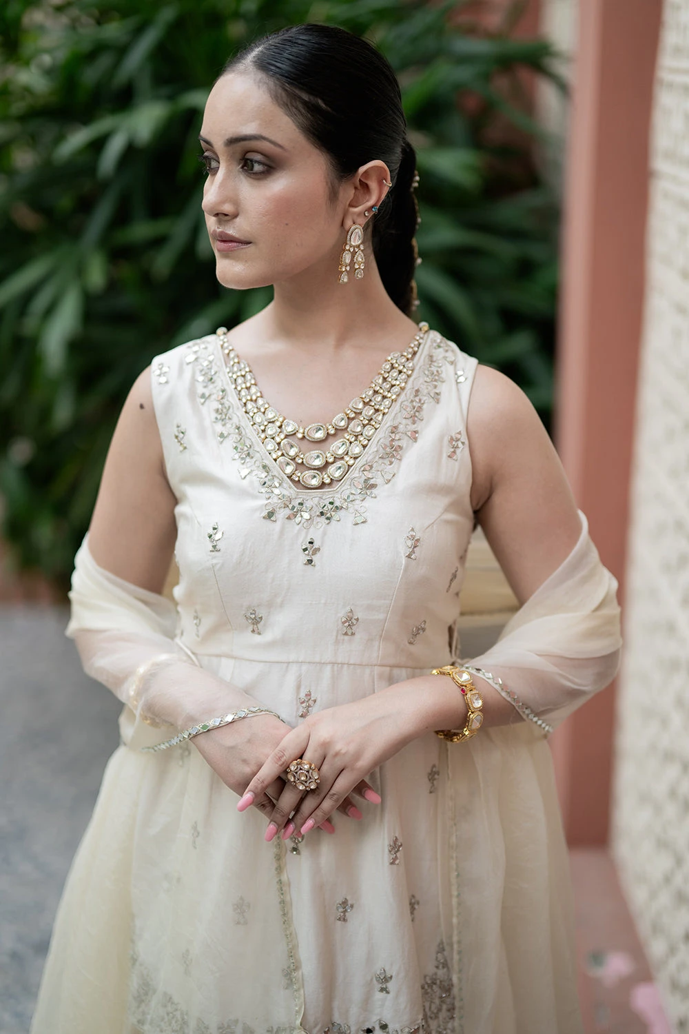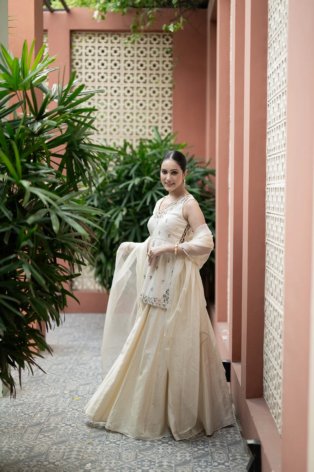 Featuring an off white mirror embroidered kurta paired with chanderi lehenga and dupatta in organza base with mirror border .