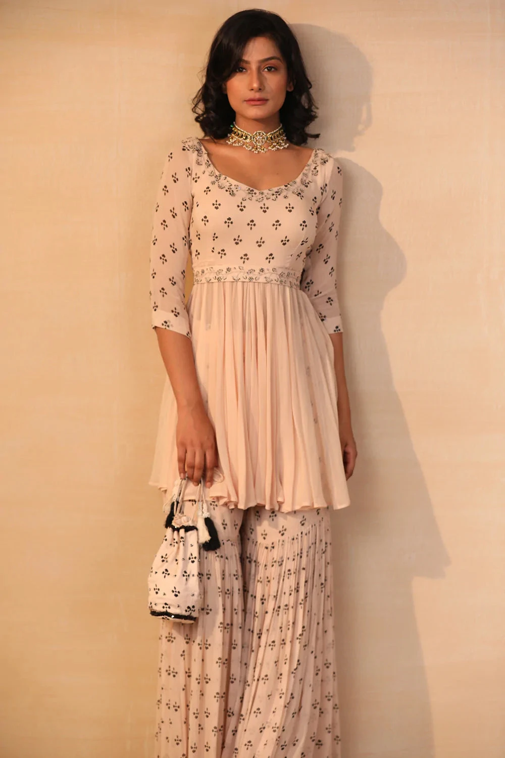 Off-white modal satin potli bag with sequin embellishments, tassel hem & black printed motifs.