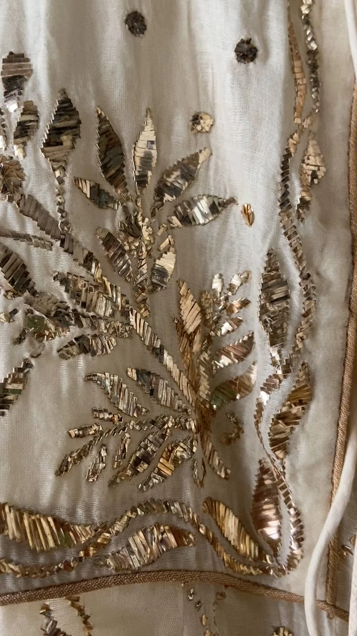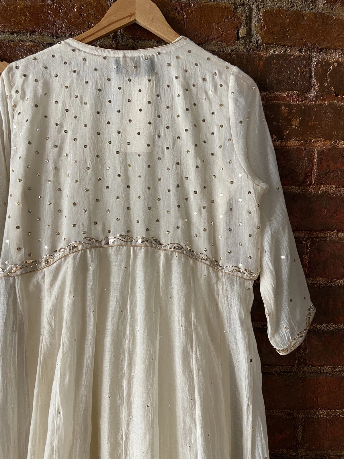Off-white Lucknowi changer kurta with delicate Mukaish (badla) hand work all over and tie-up detailing. Comes with Mukaish work dupatta and cotton silk pants.