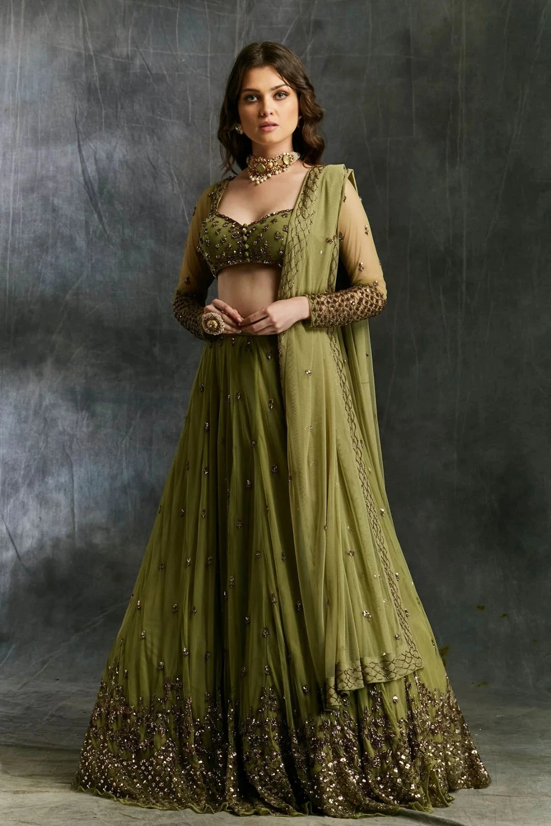 Olive Green Lehenga With A Deep Back And Antique Work Boot is Is Different Yet Classic | Fabric- Net | Dryclean Only