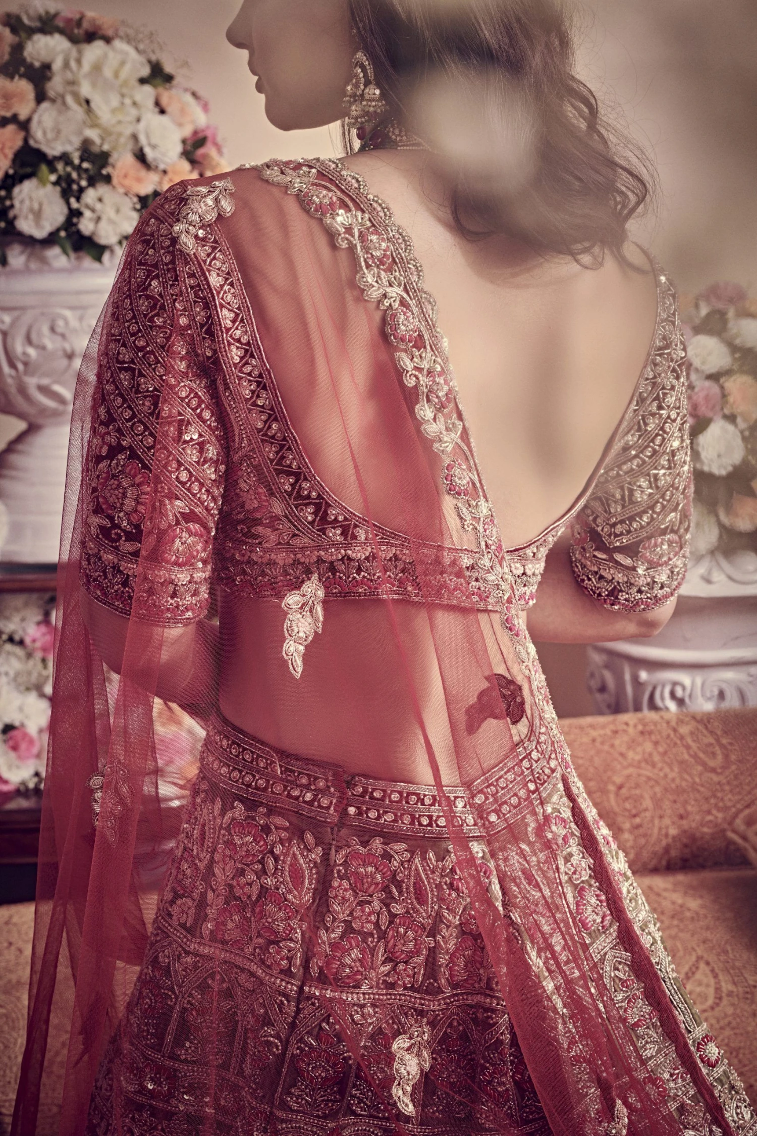 Eugenia belousora is draped in maroon velvet statement blouse with olive velvet lehenga base clearly ditching the monotones and giving the ensemble a unique spin.