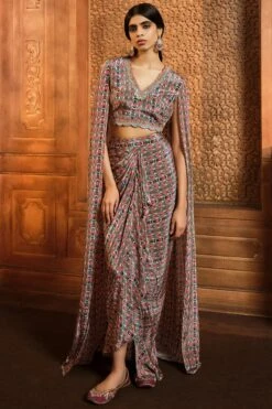 Featuring A Olive Green Stripes Printed Blouse With Attached Cape At Back, Embroidered Neckline With Pearl Highlight In Front. It Comes Along With A Draped Frill Skirt To Complete The Look.