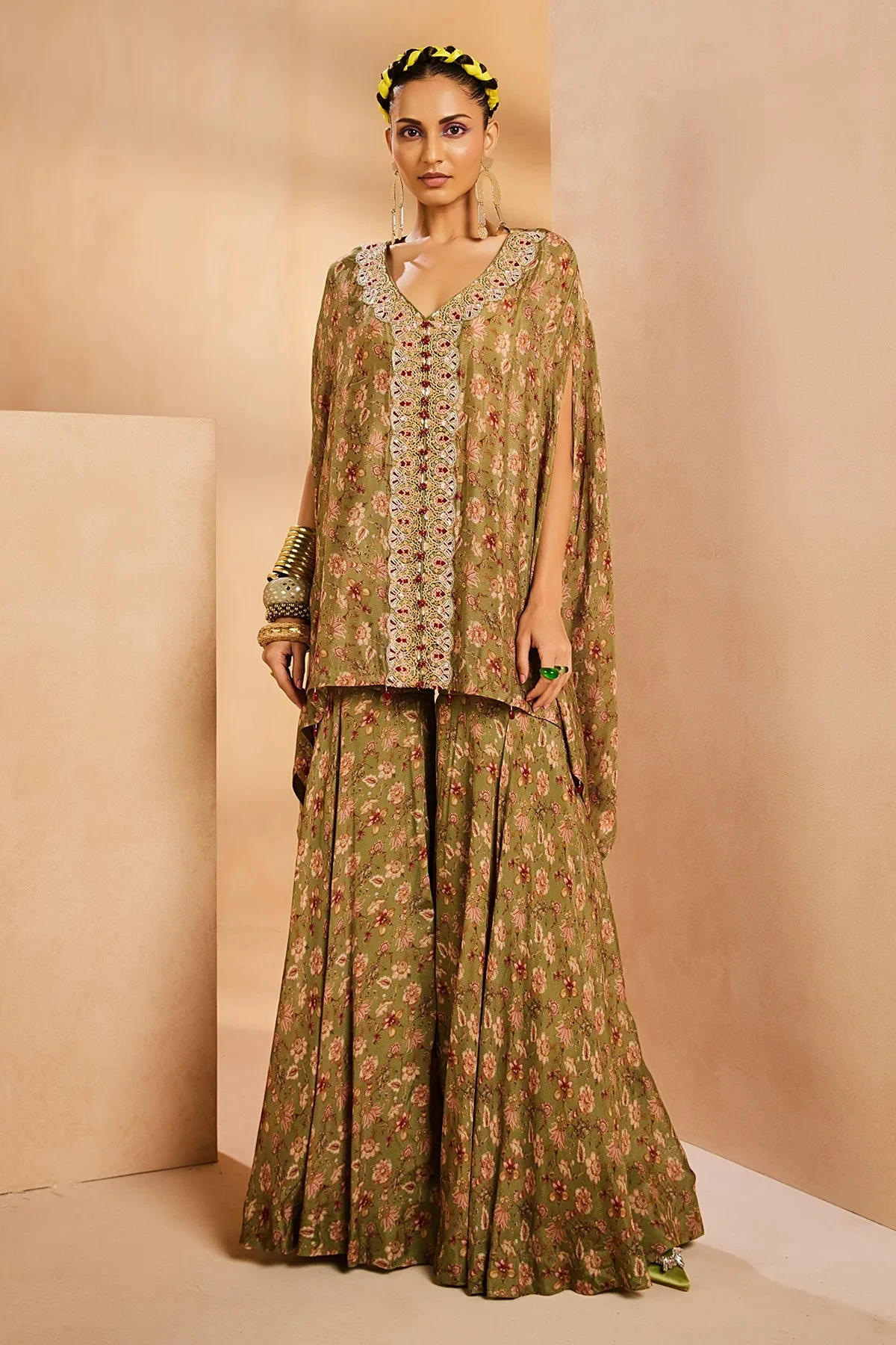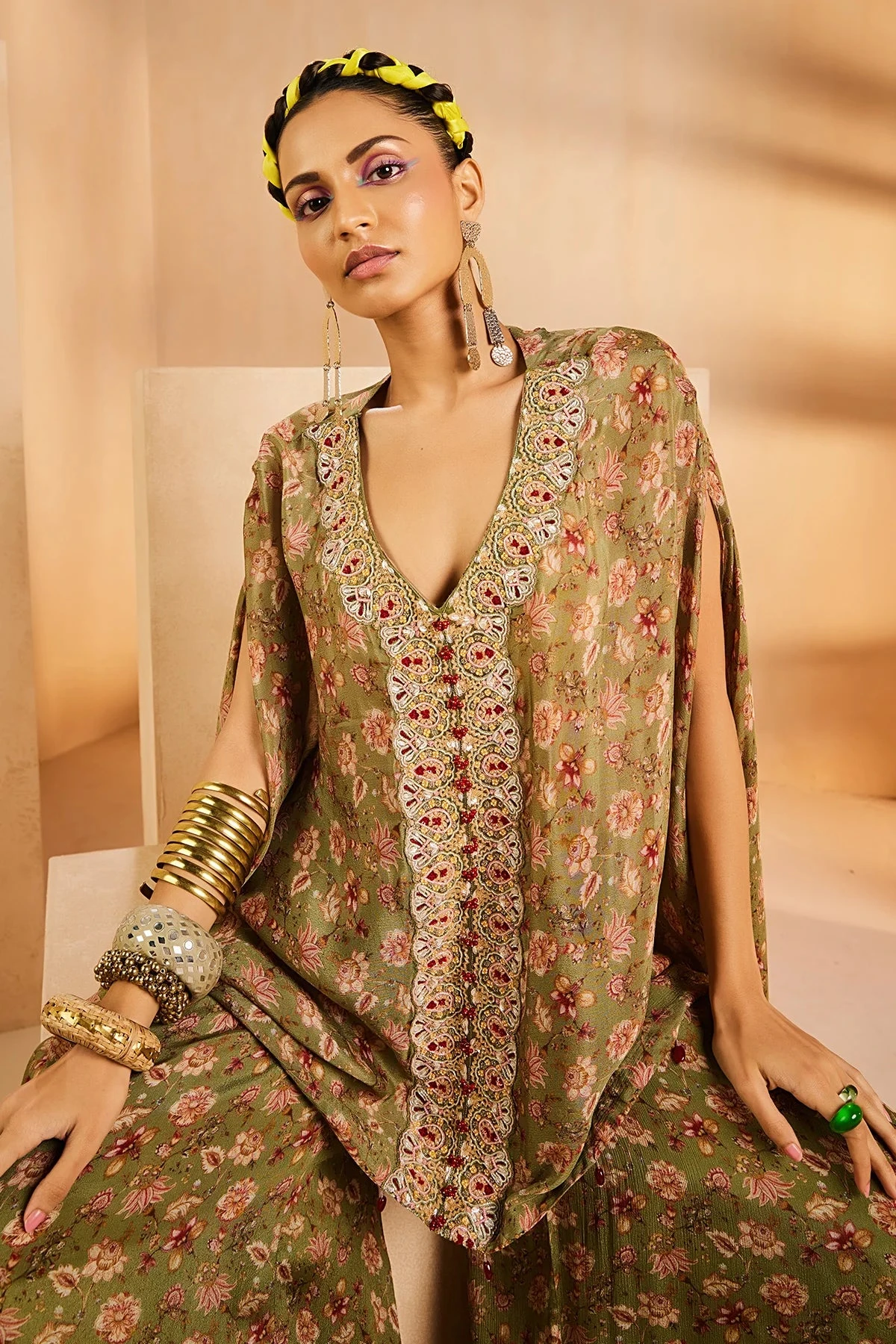 Featuring a easy to wear vintage floral kaftan top with gharara pants. The kaftan has a very intricately fully hand embroidered border panel with colourful japanese bugle beads , sequences and cutdana. The kaftan is accentuated with colourful bead stones
